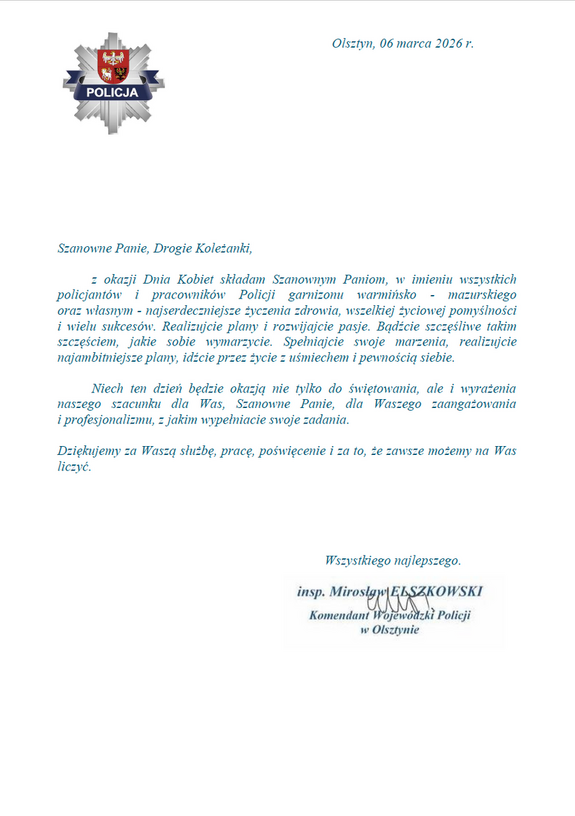 Słowa uznania i życzenia z okazji Dnia Kobiet do pracownic oraz policjantek garnizonu warmińsko-mazurskiego skierował insp. Mirosław Elszkowski Komendant Wojewódzki Policji w Olsztynie.