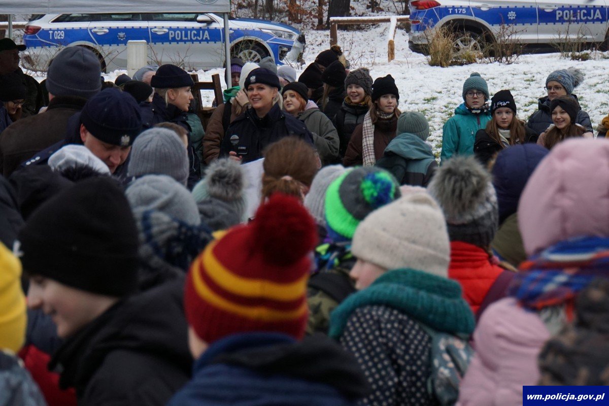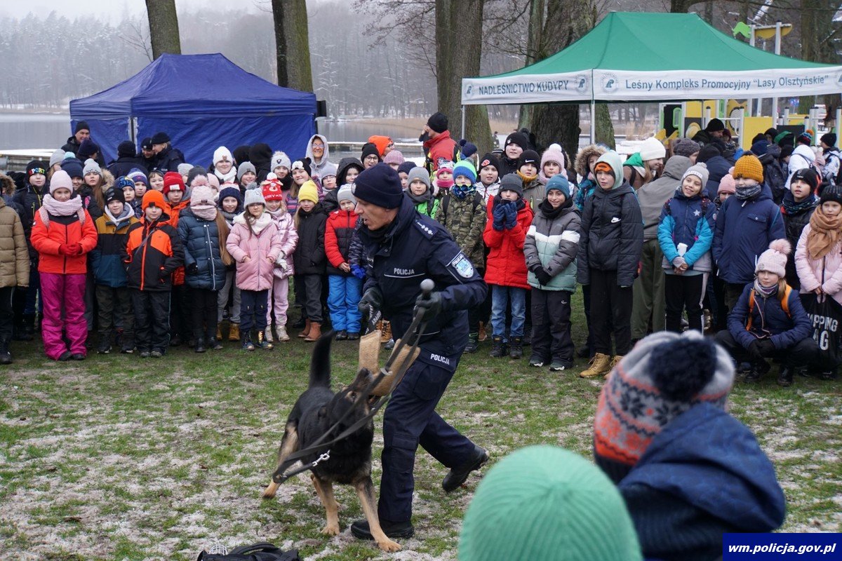 Jedno z takich spotkań odbyło się w czwartek (19.01.2023) na plaży nad jeziorem Limajno w miejscowości Swobodna (gm. Dobre Miasto). Ponad 400 dzieciaków z lokalnych szkół spotkało się tam z policjantami w związku z cyklem festynów profilaktycznych „ Bezpieczne ferie w powiecie olsztyńskim”, organizowanych przez Starostwo Powiatowe w Olsztynie oraz zaprzyjaźnione służby i instytucje, takie jak Komenda Miejska Policji w Olsztynie, Komenda Miejska Państwowej Straży Pożarnej w Olsztynie, Lasy Państwowe, Wody Polskie, Nadleśnictwa Nowe Ramuki, Kudypy, Olsztynek, Olsztyn, Wipsowo i Wichrowo oraz gminy Olsztynek, Dobre Miasto, Biskupiec i Barczewo. Na dzieci czekały niespodzianki przygotowane m.in. przez policjantów, takie jak pokaz posłuszeństwa psa służbowego oraz nauka obrony przed agresywnym psem, a także namiot profilaktyczny, w którym przeprowadzone zostały konkursy (z nagrodami) z zakresu wiedzy na temat zasad bezpieczeństwa w ruchu drogowym. Nie zabrakło też dzielnego Sierżanta Bobra z KWP w Olsztynie, który mimo padającego śniegu i panującego chłodu z uśmiechem pozował do zdjęć z dziećmi i młodzieżą i towarzyszył im podczas zabawy.