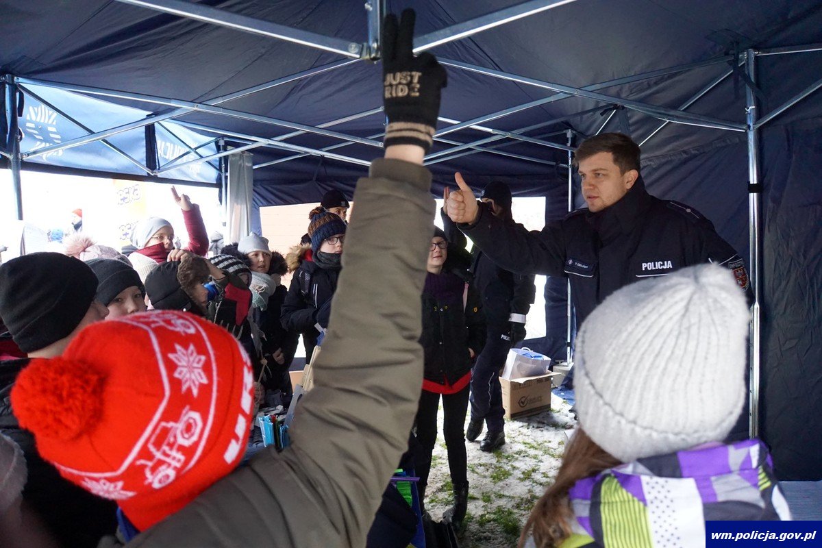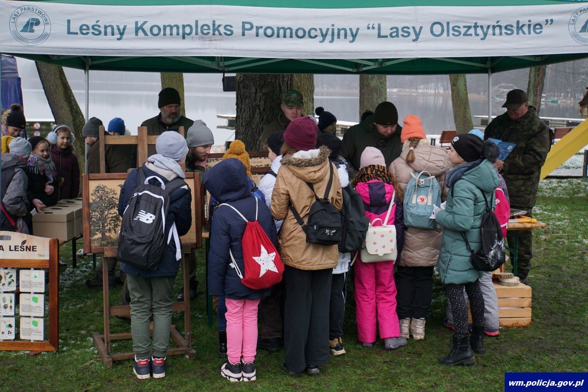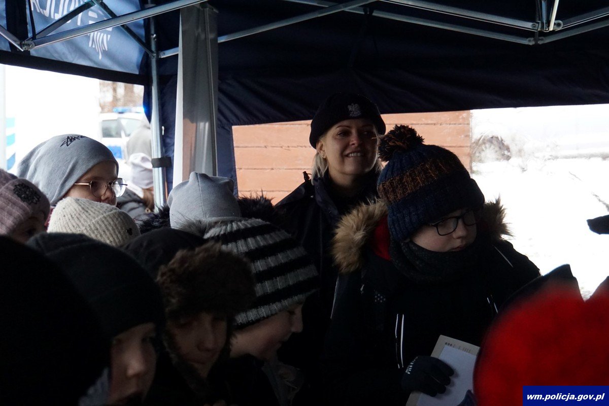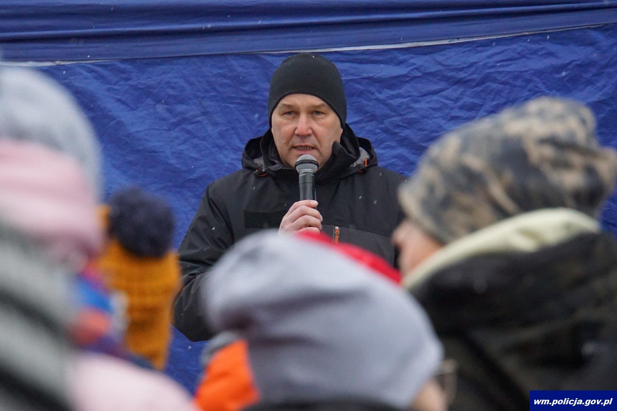 Czwartkowy festyn był również sceną dla inauguracji wojewódzkich działań „Bezpieczne Ferie”. Dlatego na miejsce przyjechali też policjanci z Komendy Wojewódzkiej Policji w Olsztynie, którym przewodził insp. Arkadiusz Sylwestrzak Zastępca Komendanta Wojewódzkiego Policji w Olsztynie, który nadzoruję pracę pionu prewencji w garnizonie. W krótkim wystąpieniu insp. Arkadiusz Sylwestrzak zwrócił się do dzieci oraz ich opiekunów, zapewniając o gotowości policjantów do intensywnej służby na rzecz bezpieczeństwa dzieci i młodzieży podczas zimowego wypoczynku. Przypomniał też o formach pomocy i wsparcia, jakie Policja kieruje do opiekunów grup młodzieży, które np. planują wyjechać na zimowisko autokarem. Policjanci właśnie dla nich przygotowali wykaz miejsc prowadzenia kontroli autobusów oraz kierowców autobusów przewożących dzieci i młodzież na wypoczynek. Wykaz ten zawiera zestawienie punktów z terenu kraju wraz z numerami telefonów kontaktowych, gdzie można uzyskać informacje na temat możliwości przeprowadzenia doraźnych kontroli autobusów i kierowców. Więcej na ten temat można przeczytać na naszej stronie: https://policja.pl/pol/aktualnosci/226952,WYKAZ-PUNKTOW-KONTROLI-AUTOBUSOW-FERIE-2023.html