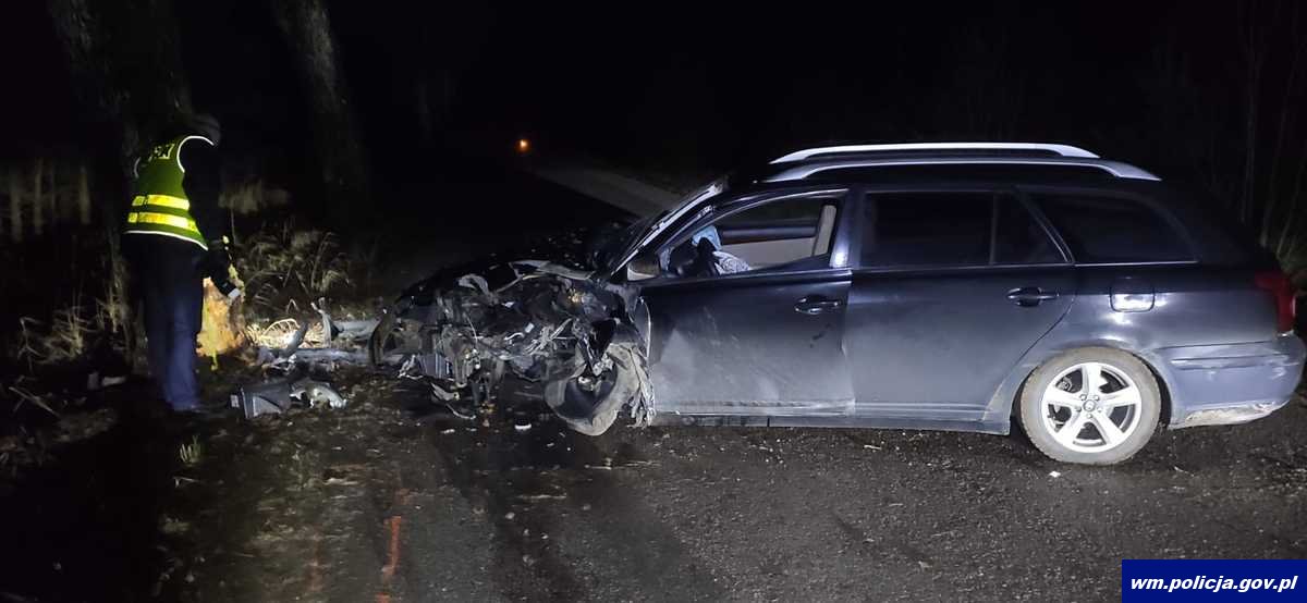 Tego samego dnia, przed godziną 19:00 w Kośmidrach doszło do kolejnego zdarzenia drogowego. Zgłaszający poinformował oficera dyżurnego tutejszej jednostki o tym, że na trasie między miejscowościami Kośmidry a Skocze auto uderzyło w drzewo. Policjanci Zespołu Ruchu Drogowego, którzy pracowali na miejscu tego zdarzenia ustalili, że 21-letnia kierująca toyotą na drodze powiatowej nr 1815N nie dostosowała prędkości do warunków panujących na drodze. Kobieta straciła panowanie nad pojazdem, zjechała z drogi i uderzyła w przydrożne drzewo. 21-latka była trzeźwa i jechała sama. Z obrażeniami głowy została przetransportowana do szpitala. Na czas obsługi zdarzenia policjanci zorganizowali objazd.
