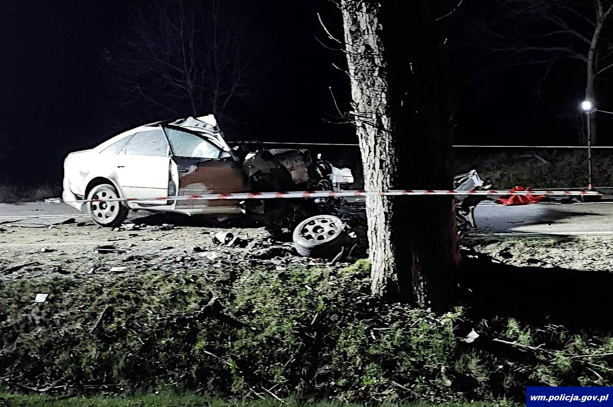 Tymczasem po godzinie 17:00 21-latek kierujący audi z nieustalonych przyczyn na łuku drogi zjechał na lewe pobocze a następnie najechał na przydrożne drzewo. W wyniku zdarzenia kierujący zginął na miejscu. Policjanci pod nadzorem prokuratora wykonywali czynności w celu ustalenia okoliczności tego tragicznego wypadku.