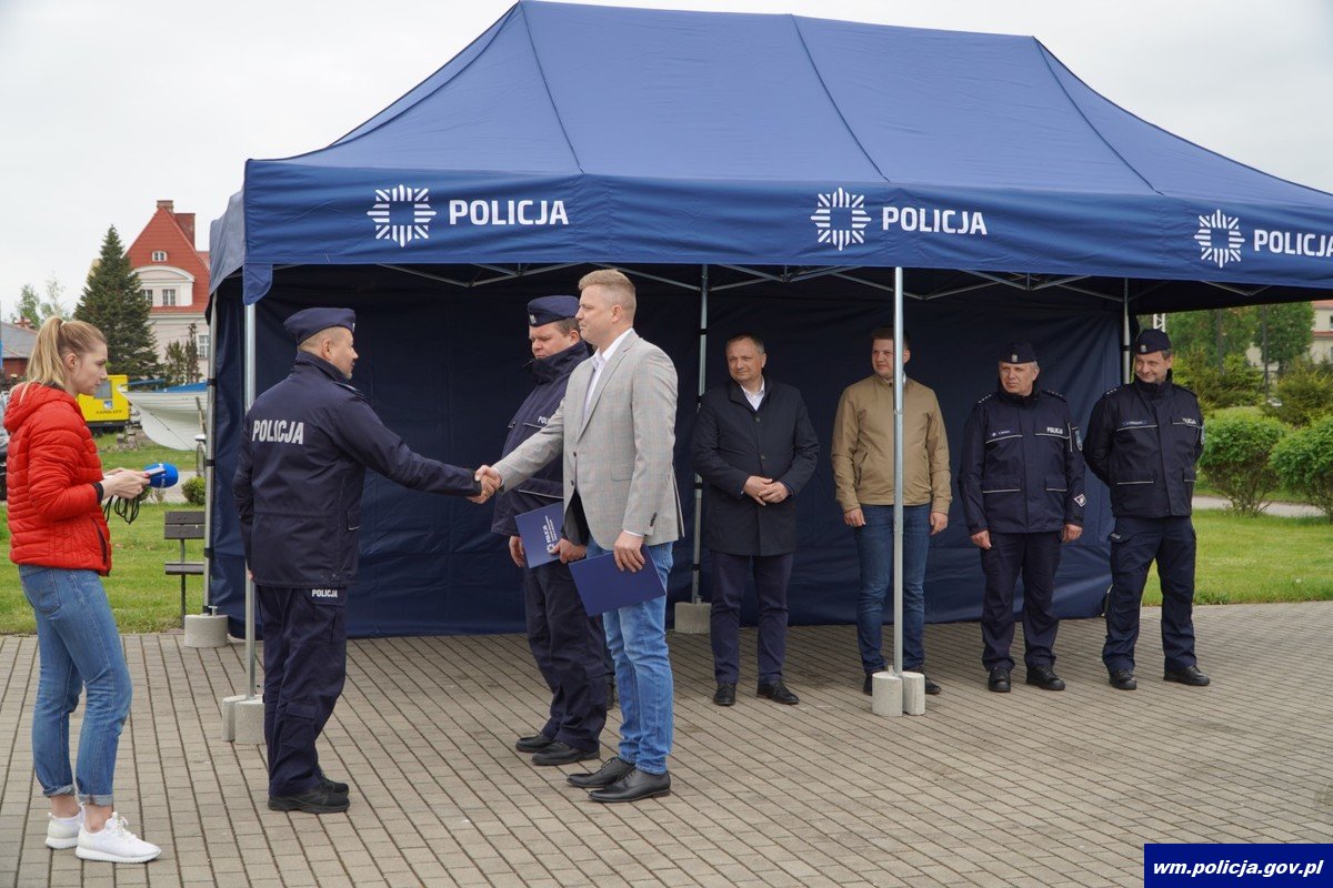 W środę (17.05.2023 r.) w porcie Ekomarina w Giżycku odbyło się uroczyste przekazanie nowego sprzętu dla giżyckich policjantów. W uroczystości udział wzięli: Komendant Wojewódzki Policji w Olsztynie nadinsp. Tomasz Klimek, Komendant Powiatowy Policji w Giżycku insp. Przemysław Rawa i jego zastępca nadkom. Sławomir Ozygała oraz funkcjonariusze giżyckiej komendy. Nie zabrakło również zaproszonych gości - Starosty Powiatu Giżyckiego Mirosława Dariusza Drzażdżewskiego, w-ce Starosty Mateusz Sierońskiego, Burmistrza Miasta Giżycka Wojciecha Karola Iwaszkiewicza. Podczas wystąpień zarówno funkcjonariusze jaki i przedstawiciele samorządu byli zgodni co do tego, że otrzymany przez Komendę Powiatową Policji w Giżycku sprzęt w znaczy sposób wpłynie na poprawę bezpieczeństwa na akwenach jak i w ruchu drogowym.