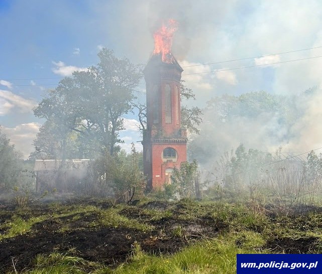W piątek (12 maja br.) około godz. 13.00 Komendant Komisariatu Policji w Rucianem- Nidzie, razem z policjantem przebywającym na terenie jednostki, zauważyli przez okno ogromne kłęby dymu unoszące się nad miastem. Natychmiast pojechali sprawdzić co się tam dzieje. Paliła się zabytkowa wieża, pobliskie zabudowania oraz przyległy teren leśny.