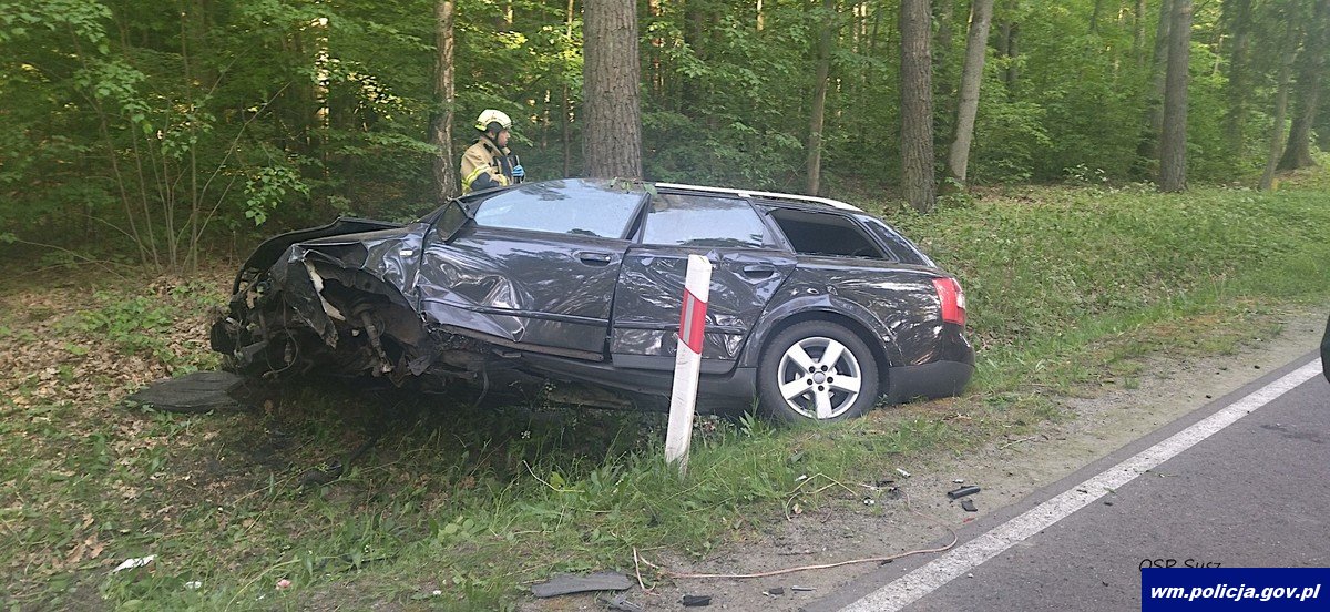 Tymczasem w gminie Susz 29-latek kierujący audi z nie ustalonych przyczyn zjechał na przeciwległy pas ruchu po czym najechał na drzewo i zatrzymał się w rowie. Kierujący z małoletnimi pasażerami został przetransportowany do szpitala.