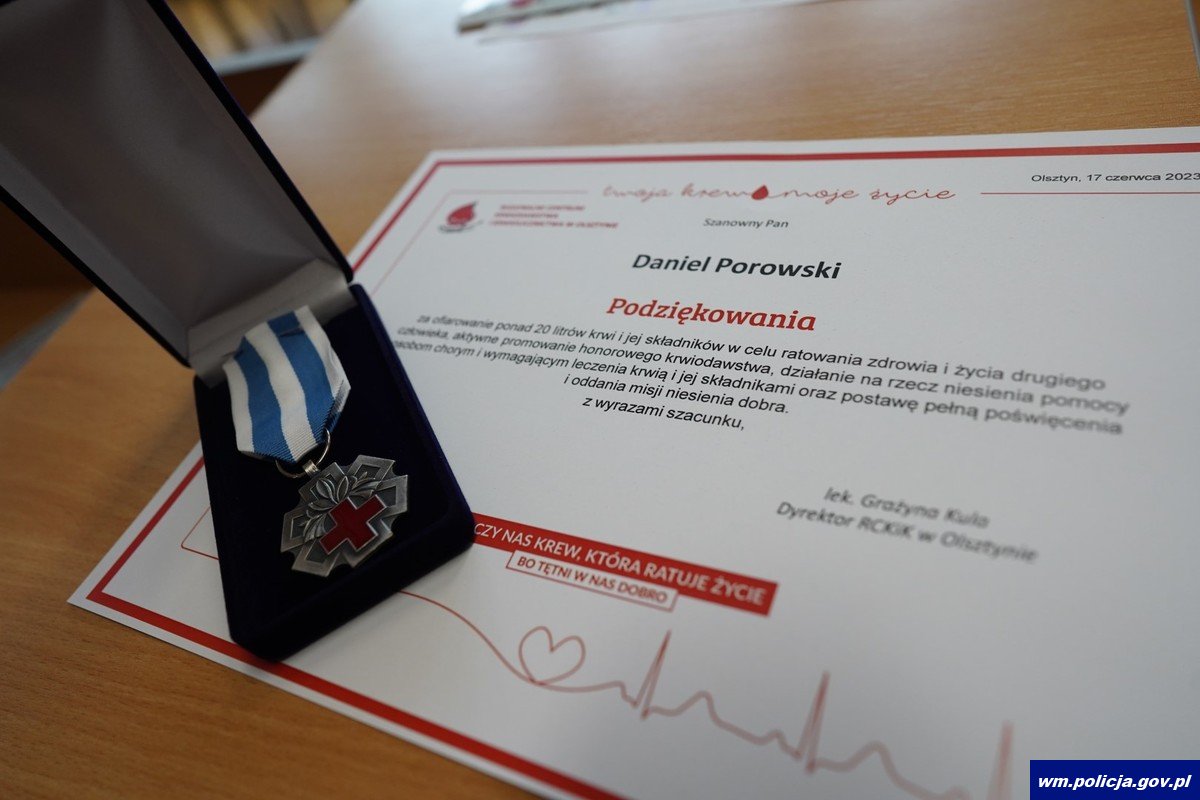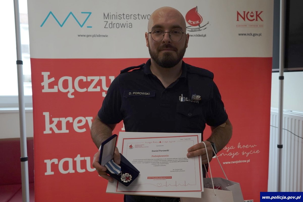 Podczas wtorkowej (04.07.2023 r.) inauguracji całej akcji, post. Daniel Porowski z Oddziału Prewencji Policji w Olsztynie odebrał legitymację oraz odznaczenie "Zasłużony Honorowy Dawca Krwi" oraz dyplom z podziękowaniem, za oddanie 20 litrów tego drogocennego płynu.