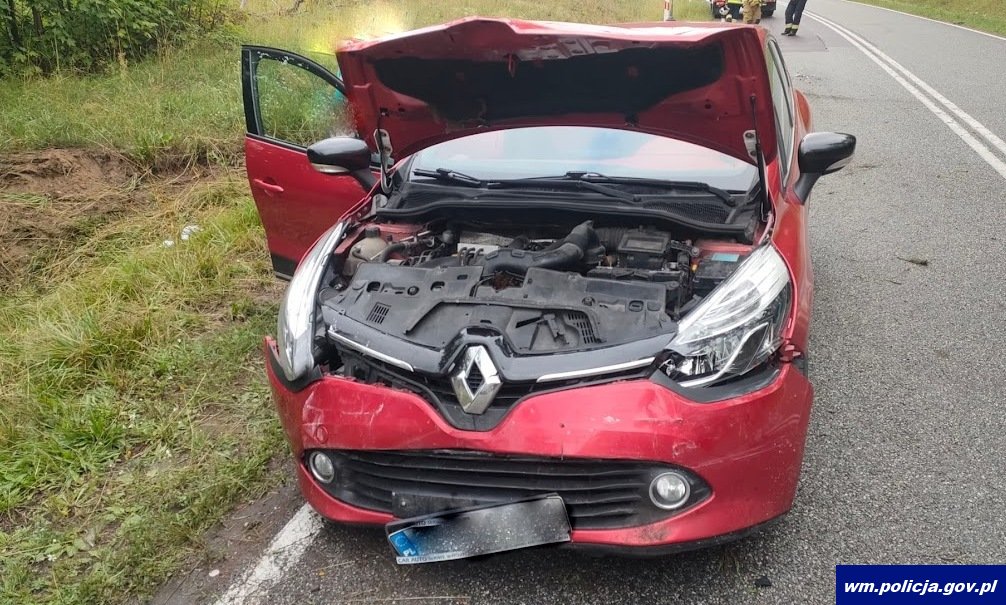 Tymczasem po 10:00 kierujący fiatem 61-latek nie dostosował prędkości do warunków panujących na drodze w wyniku czego wypadł ze swojego pasa ruchu i uderzył w bok naczepy prawidłowo jadącego renaulta.