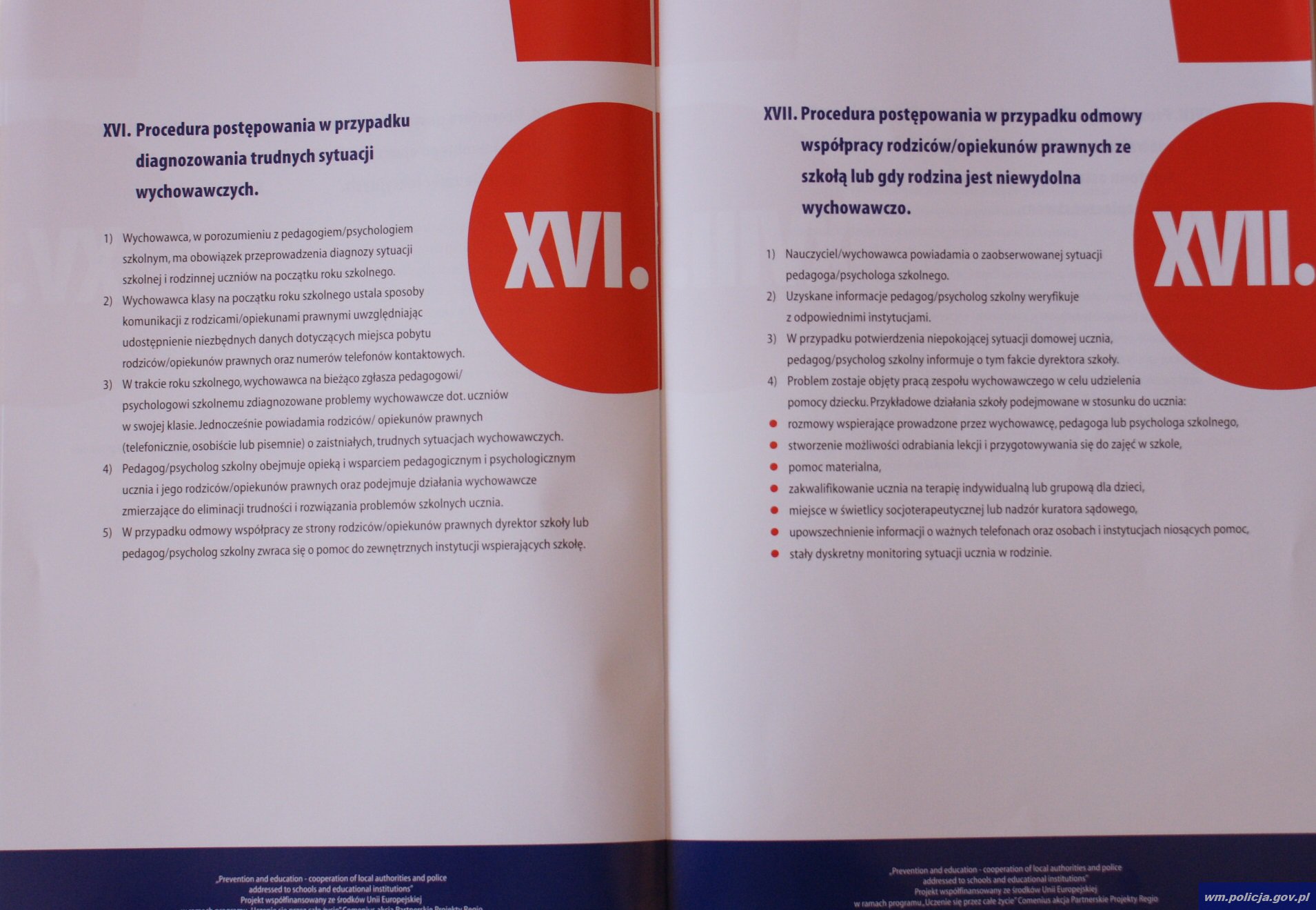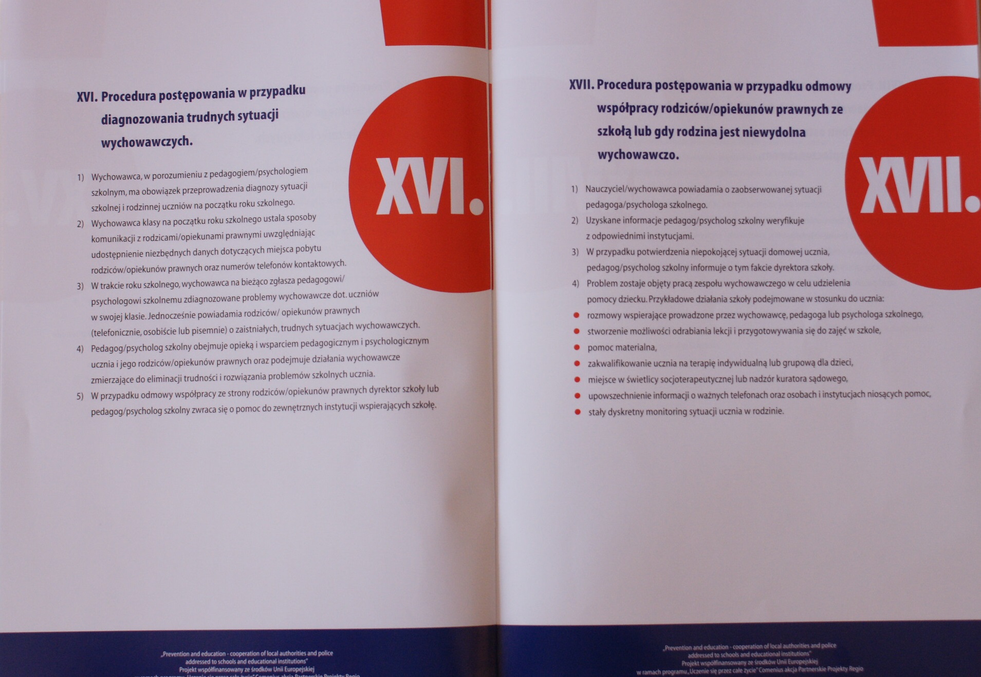 Wydane opracowanie zawiera zbiór procedur postępowania oraz strategię działań wychowawczych, zapobiegawczych i interwencyjnych wobec dzieci i młodzieży. Poradnik podzielony jest na zagadnienia tematyczne oraz algorytmy postępowania. Określono w nim 21 sytuacji, które mogą zdarzyć się w szkole, ale i poza nią. Czytamy tu m.in. o tym jak działać w sytuacji gdy mamy do czynienia z przemocą i agresją wśród uczniów, gdy zostaną znalezione narkotyki lub inne niebezpieczne substancje lub gdy uczeń jest pod wpływem takich substancji lub alkoholu.
