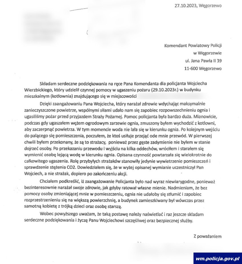 Starszy posterunkowy Wojciech Wierzbicki z Komendy Powiatowej w Węgorzewie pomógł ugasić pożar w budynku mieszkalnym znajdującym się w miejscowości Krzywińskie w gminie Pozezdrze. W niedzielę 29 października 2023 roku patrol policji został wezwany na interwencję do jednej z miejscowości w powiecie węgorzewskim. Na miejscu okazało się, że w budynku mieszkalnym, w kotłowni powstał pożar. Starszy posterunkowy Wojciech Wierzbicki oświadczył : „bez wahania ruszyłem z pomocą dla mężczyzny, który próbował sam ugasić pożar”. Funkcjonariusz nie zważając na zagrożenie swojego życia oraz zdrowia udzielił pomocy. Dzięki jego zaangażowaniu ogień nie rozprzestrzenił się, a akcja