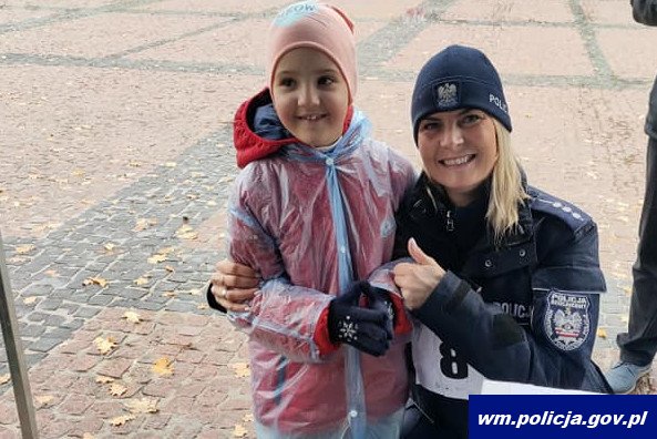 Policjanci zabezpieczajacy trasę biegu w Ełku -
