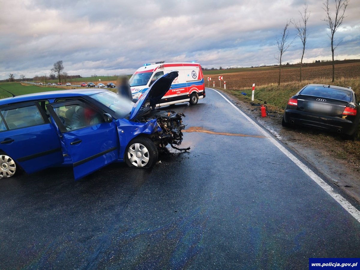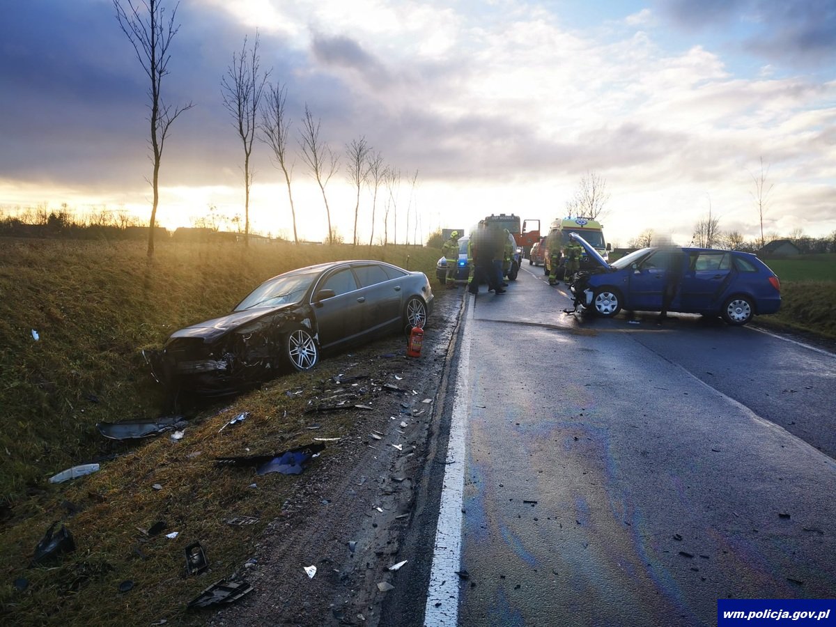 We wtorek (26.12.2023 r.) po godz. 13:00 oficer dyżurny mrągowskiej komendy został poinformowany o zdarzeniu drogowym na drodze krajowej nr 16 w okolicy miejscowości Woźnice. Ze wstępnych ustaleń policjantów pracujących na miejscu zdarzenia wynika, że kierujący pojazdem skoda jadąc drogą krajową nr 16 od strony miejscowości Olszewo w kierunku miejscowości Woźnice na łuku drogi w prawo stracił panowanie nad pojazdem, zjechał na przeciwległy pas ruchu i zderzył się z pojazdem audi. Skodą oprócz 60-letniego kierowcy podróżowało 3 pasażerów. Dwoje z nich zostało przewiezionych do szpitala na badania, natomiast pojazdem audi jechał 28-letni kierujący wraz z pasażerką. Pasażerka z audi również została przetransportowana do szpitala. Po badaniach okazało się, że pasażerka z audi doznała urazu powodującego rozstrój zdrowia poniżej 7 dni, natomiast pasażerowie podróżujący skodą doznali obrażeń trwających dłużej niż 7 dni, wobec czego zdarzenie zostało zakwalifikowane jako wypadek drogowy. Policjanci na miejscu sprawdzili trzeźwość obu kierujących- obaj trzeźwi. Droga była zablokowana, zorganizowano objazd przez miejscowość Ryn. Policjanci wyjaśniają okoliczności tego zdarzenia.