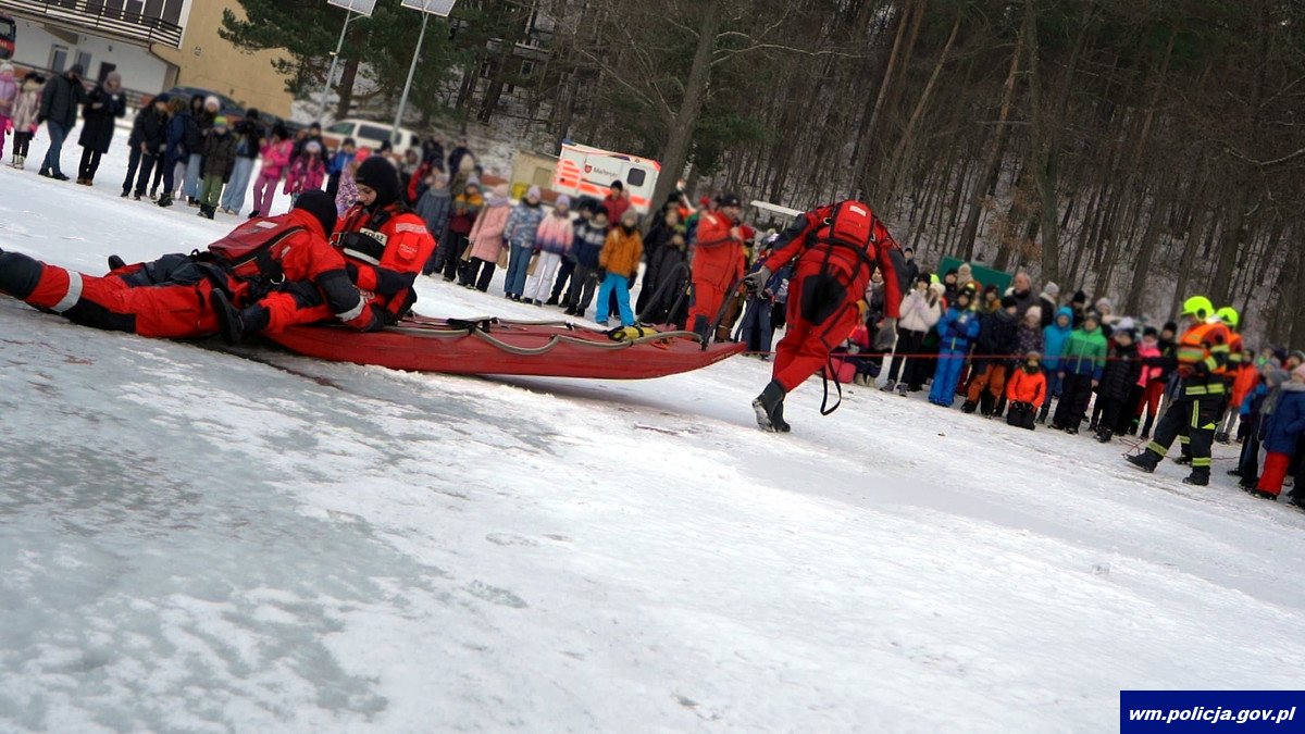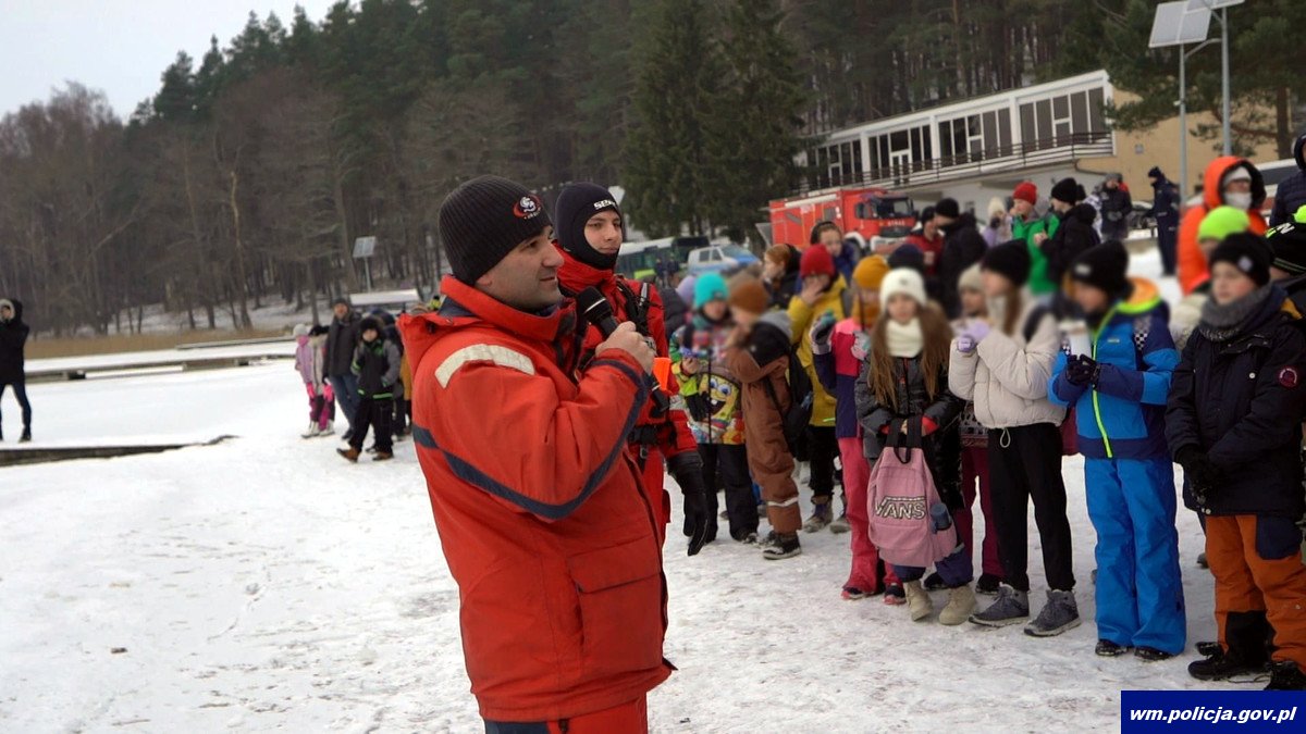 Policyjne działania „Bezpieczne ferie” na Warmii i Mazurach zostały zainaugurowane w czwartek (18.01.2024) przed południem na plaży nad jez. Limajno w miejscowości Swobodna (gm. Dobre Miasto). Tam policjanci z partnerami z innych instytucji, m.in. z olsztyńskiego starostwa, Państwowej Straży Pożarnej i innych, zaprosili dzieciaki ze szkół w powiecie, by przypomnieć im o podstawowych zasadach bezpiecznego zimowego wypoczynku oraz przeprowadzili pokazy ratownictwa wodnego, udzielania pierwszej pomocy o wyszkolenia psa służbowego.