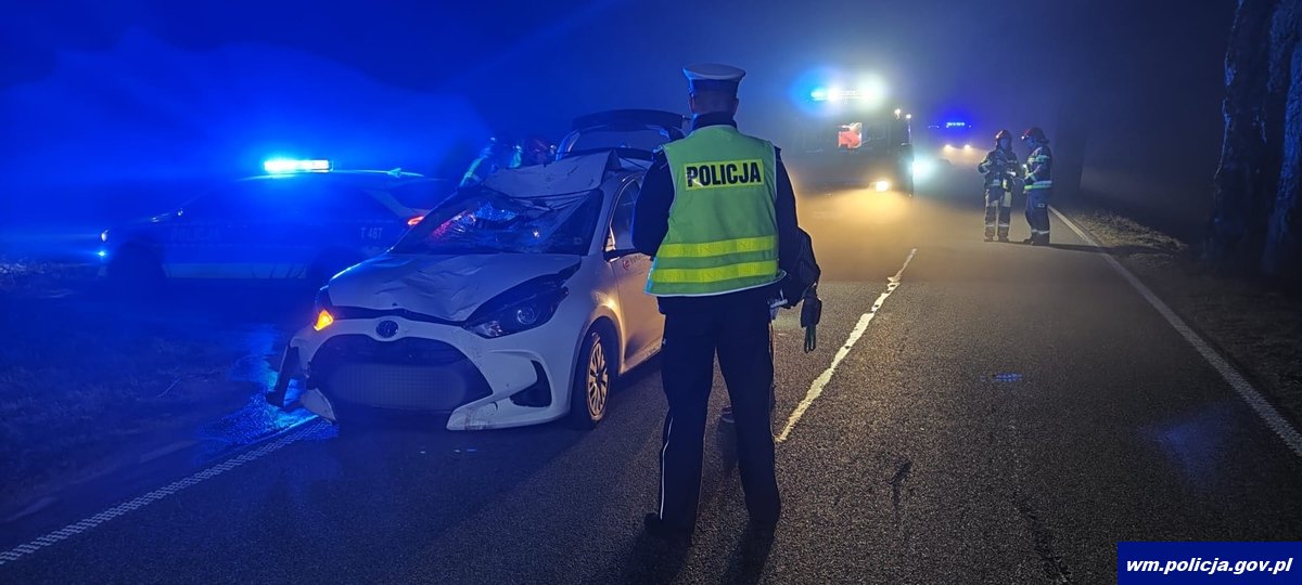 Policjanci pracowali na miejscu zdarzenia drogowego, do którego doszło na drodze wojewódzkiej W-650, w miejscowości Trygort. Kierujący osobową toyotą zderzył się z łosiem. Siła uderzenia była tak duża, że zwierzę zginęło na miejscu. Auto natomiast zostało poważnie uszkodzone. Siedzący za kierownicą 42-latek z obrażeniami głowy został przewieziony do Szpitala Powiatowego w Giżycku.
