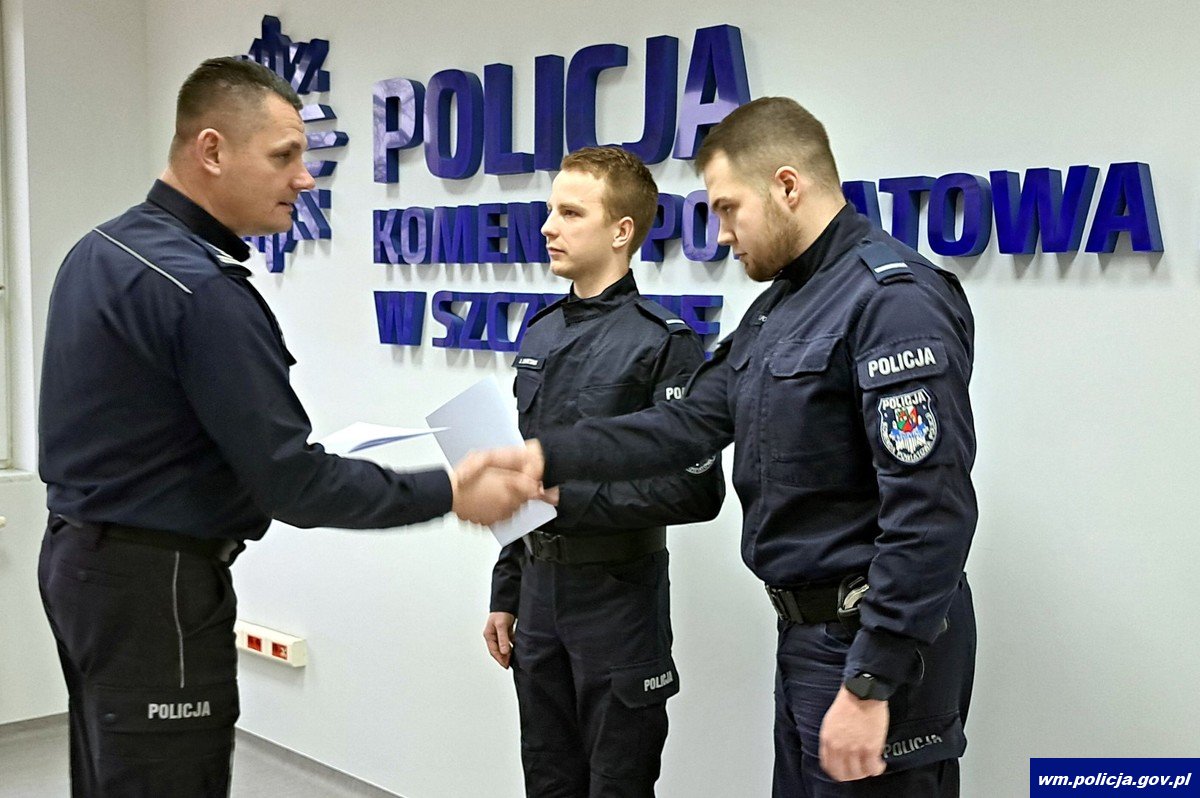 Komendant Powiatowy Policji w Szczytnie insp. Radosław Drach wyróżnił policjantów i pogratulował st. post. Jakubowi Chwesiukowi i st. post. Kamilowi Polakowi postawy godnej funkcjonariusza Polskiej Policji. Komendant podkreślił, że dzięki odwadze i zachowaniu zgodnym ze słowami roty ślubowania, kobieta została uratowana i nie odniosła poważniejszych obrażeń w wyniku pożaru.