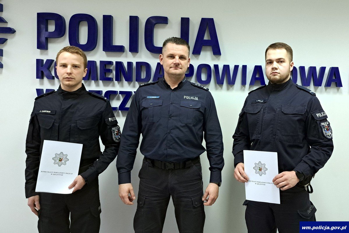 Funkcjonariusze z Komendy Powiatowej Policji w Szczytnie wynieśli 87-letnia kobietę z domu, w którym wybuchł pożar. Na jego miejsce jako pierwsi dotarli st. post. Jakub Chwesiuk i st. post. Kamil Polak. Przed przyjazdem strażaków, bez chwili zawahania, wbiegli do budynku i ewakuowali schorowaną kobietę, która nie była w stanie wyjść na zewnątrz o własnych siłach. Komendant Powiatowy Policji w Szczytnie insp. Radosław Drach wyróżnił swoich podwładnych i podziękował im za działanie zgodne ze słowami roty ślubowania.