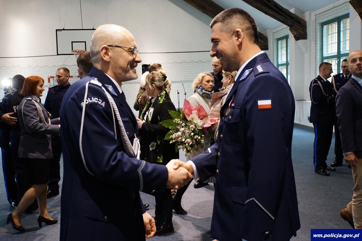 Jestem przekonany, że ta wiedza od podszewki, dotycząca potrzeb policji, dotycząca braków w policji, ale też i oczekiwań w policji, pozwoli Panu Komendantowi wspierać nasze działania na ulicy tak, abyśmy mogli skutecznie i profesjonalnie pełnić służbę na rzecz naszych mieszkańców. Panie Komendancie, bardzo Panu gratuluję awansu, ale też dziękuję, że przyjął Pan tak trudne obowiązki, bo praca w logistyce to równie trudna i równie ważna i odpowiedzialna praca, jak w pionie kryminalnym czy prewencyjnym.