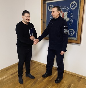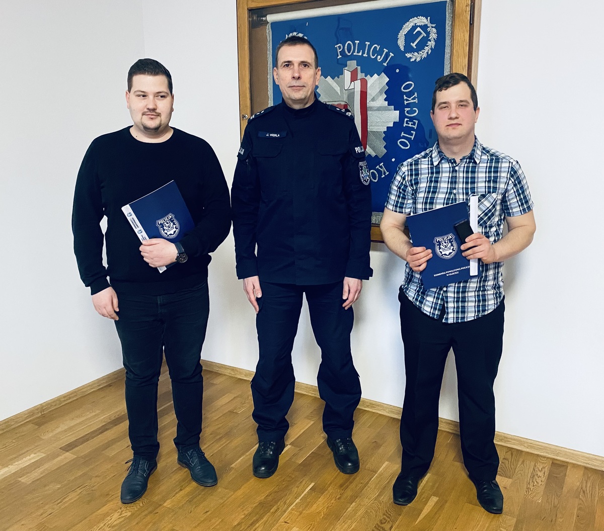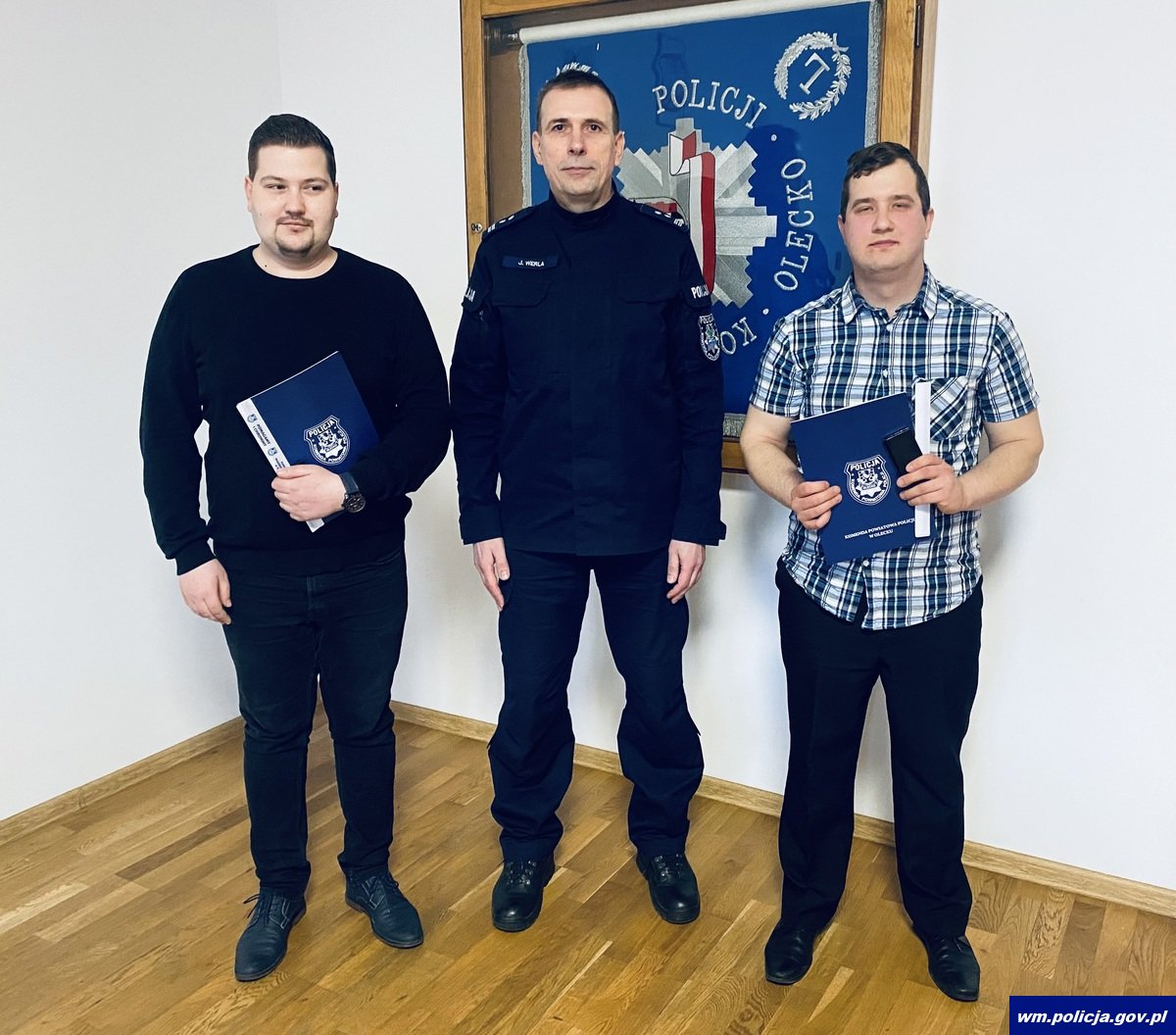 We wtorek (12.03.2024 r.) w Komendzie Powiatowej Policji w Olecku mł. insp. Jarosław Werla p.o. Komendant Powiatowy Policji w Olecku osobiście pogratulował oraz wręczył mężczyznom dyplom, wyrażając tym samym podziękowanie i wyrazy uznania. Jak powiedział: