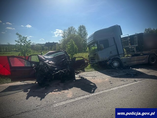 W czwartek (09.05.2024r.) około godziny 15:00 na drodze wojewódzkiej nr 537 pomiędzy miejscowościami Marwałd – Wygoda w gminie Dąbrówno doszło do tragicznego w skutkach zdarzenia drogowego. Jak ustalili policjanci pracujący na miejscu zdarzenia, 30-letni kierujący osobowym oplem na prostym odcinku drogi z niewyjaśnionych przyczyn zjechał na przeciwległy pas ruchu doprowadzając do czołowego zderzenia z ciężarową scanią. W wyniku zdarzenia śmierć na miejscu poniósł kierowca opla oraz podróżująca z nim 28-letnia kobieta. W pojeździe znajdowała się również niespełna czteroletnia córka ofiar wypadku. Po udzieleniu jej pomocy przez zespół ratownictwa medycznego została przetransportowana Lotniczym Pogotowiem Ratowniczym do pobliskiego szpitala. Na miejscu zdarzenia pracowali policjanci ostródzkiej drogówki, którzy przeprowadzili badanie stanu trzeźwości kierowcy ciężarówki. Mężczyzna był trzeźwy.