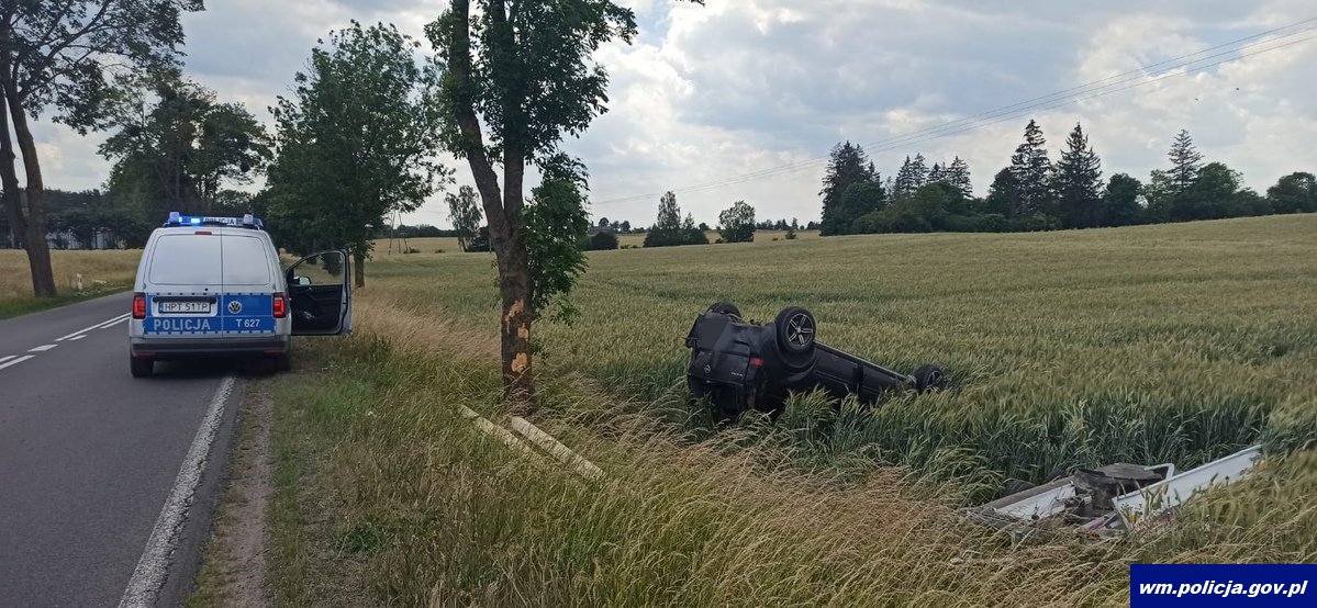 Tego samego dnia po godz. 12:00 oficer dyżurny Komendy Powiatowej Policji w Mrągowie skierował kolejny patrol policjantów na trasę pomiędzy Pieckami a Nawiadami, gdzie miało dojść do dachowania pojazdu z przyczepką. Funkcjonariusze, którzy przybyli na miejsce zdarzenia wstępnie ustalili, że 41-letni kierujący oplem jadąc z przyczepką stracił panowanie nad pojazdem, w wyniku czego wjechał do rowu, gdzie pojazd dachował. Najprawdopodobniej przyczyną tego zdarzenia była awaria opony w przyczepie. Na szczęście ani kierowca, ani pasażerka nie doznali poważnych obrażeń.
