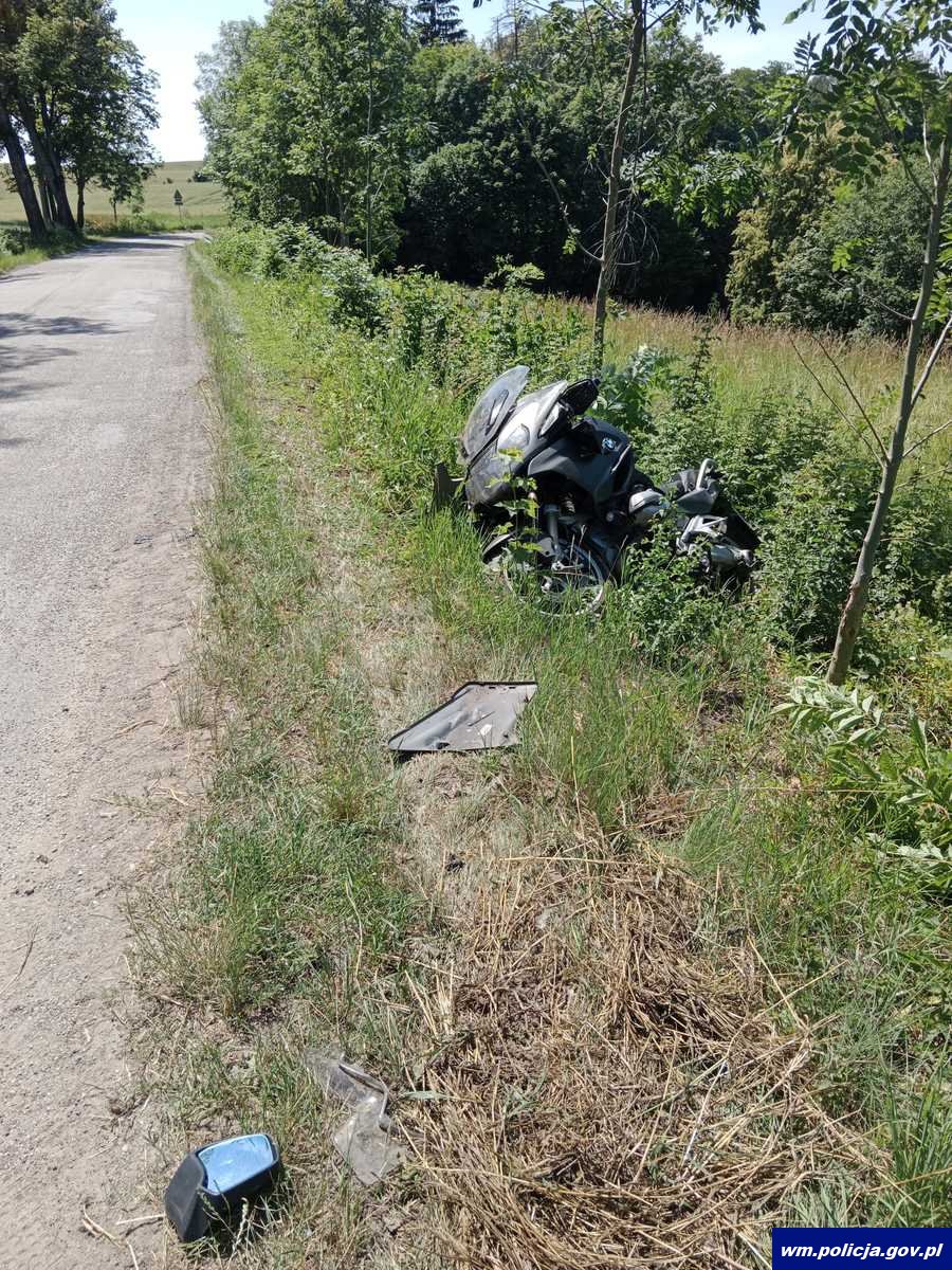 Drugie zdarzenie drogowe miało miejsce po godz. 12:30 w miejscowości Szklarnia. Ze wstępnych ustaleń funkcjonariuszy wynika, 47-letni kierujący motocyklem BMW na łuku drogi, gdzie znajdował się zalegający na jezdni piasek, wpadł w poślizg, w wyniku czego stracił panowanie nad pojazdem i wjechał do przydrożnego rowu. Mężczyzna z podejrzeniem urazu nogi został przewieziony do szpitala, gdzie okazało się, że doznał obrażeń powodujących rozstrój zdrowia powyżej 7 dni.