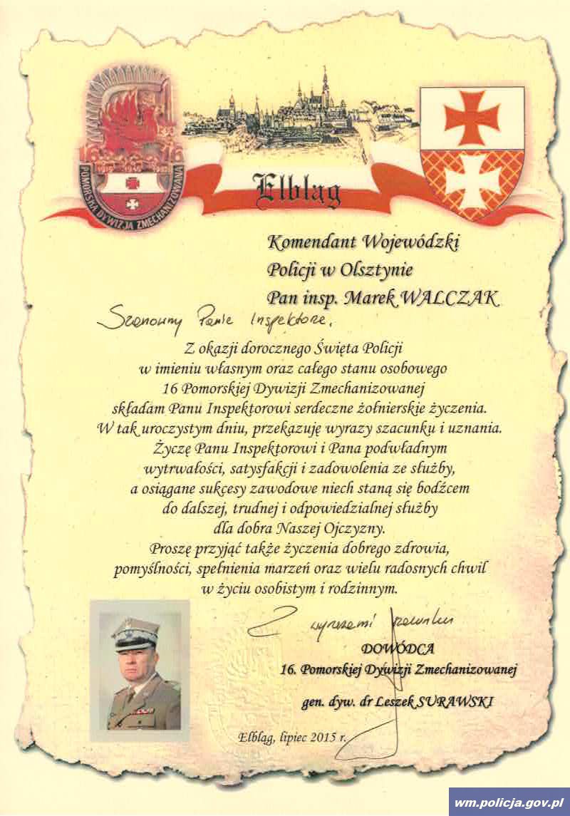 Życzenia od gen. dyw. dr Leszka Surawskiego Dowódcy 16 PDZ -