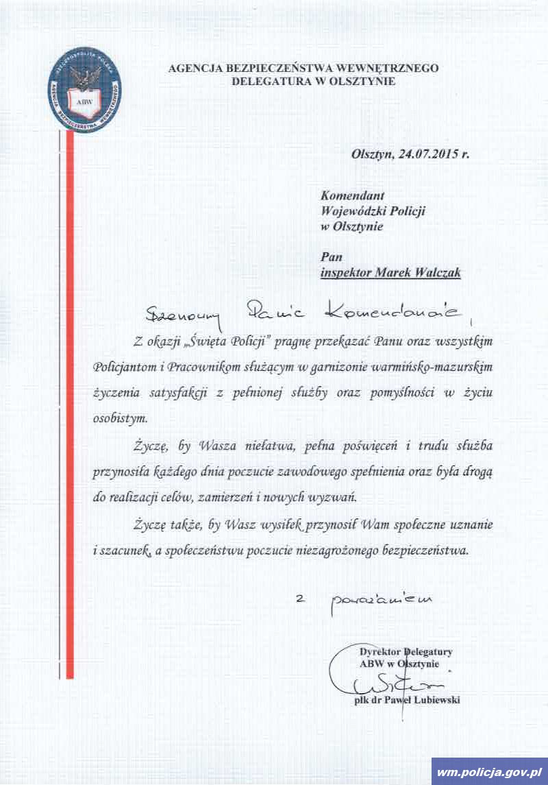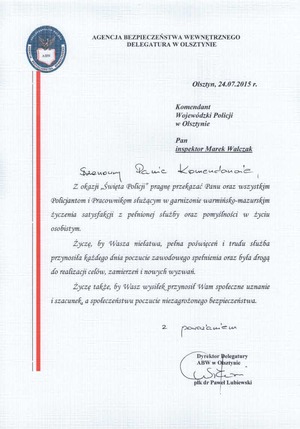 Życzenia od płk dr Pawła Lubiewskiego Dyrektora Delegatury ABW w Olsztynie -