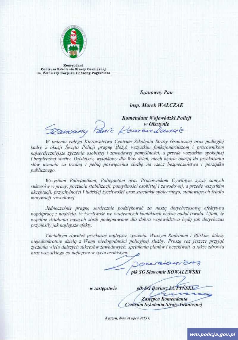 Życzenia od płk SG Sławomira Kowalewskiego Komendanta Centrum Szkolenia Straży Granicznej w zastępstwie płk SG Dariusza Lutyńskiego -