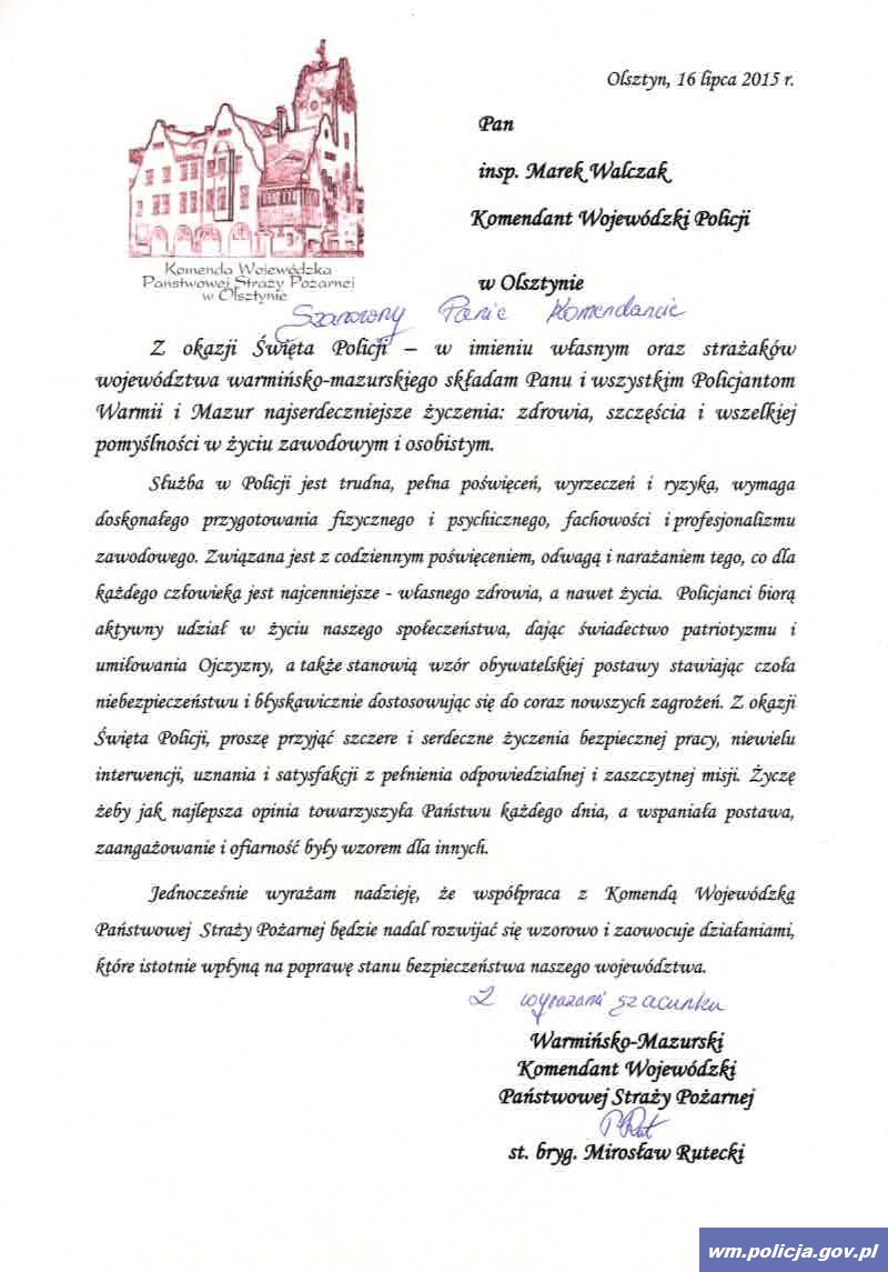 Życzenia od st. bryg. Mirosława Ruteckiego Warmińsko - Mazurskiego Komendanta Wojewódzkiego Państwowej Straży Pożarnej -