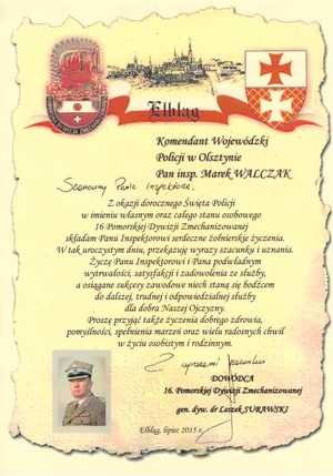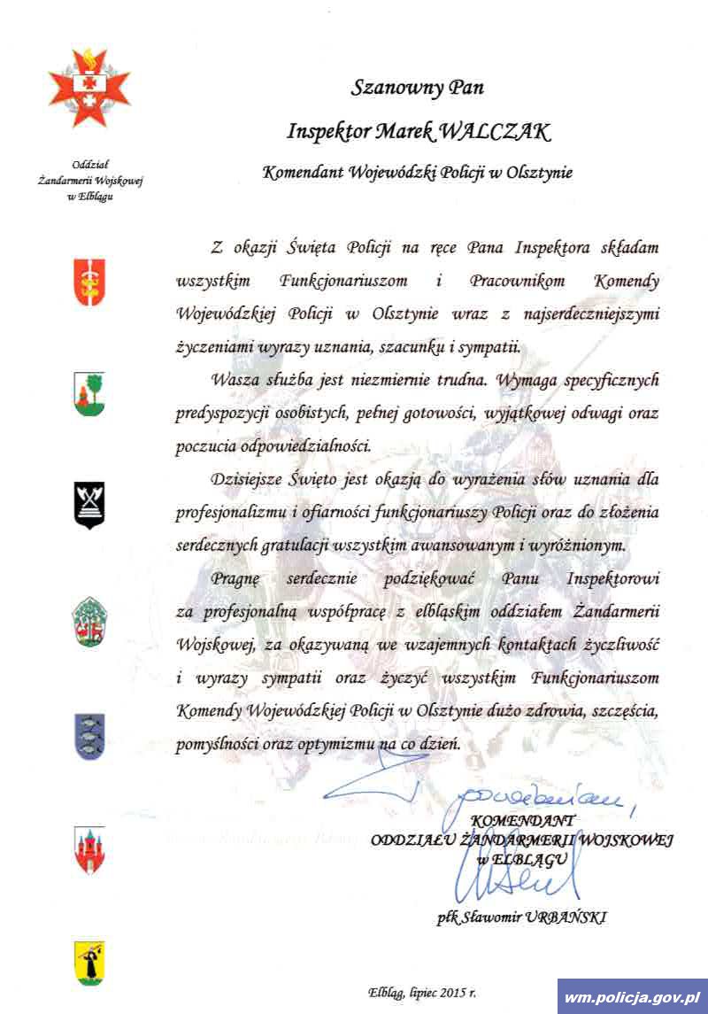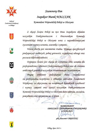 Życzenia od płk Sławomira Urbańskiego Komendanta Oddziału Żandarmerii Wojskowej w Elblągu -
