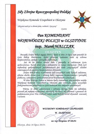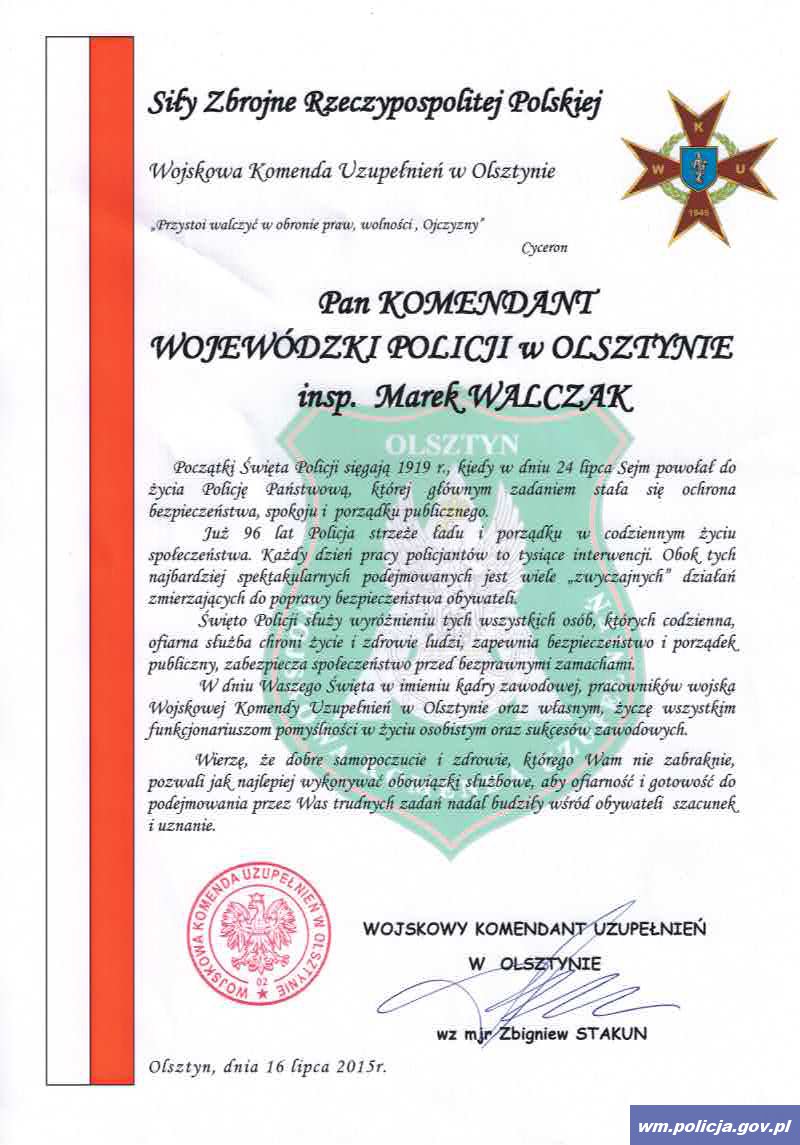 Życzenia od Wojskowego Komendanta Uzupełnień w Olsztynie wz mjr Zbigniewa Stakuna -