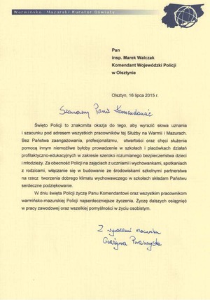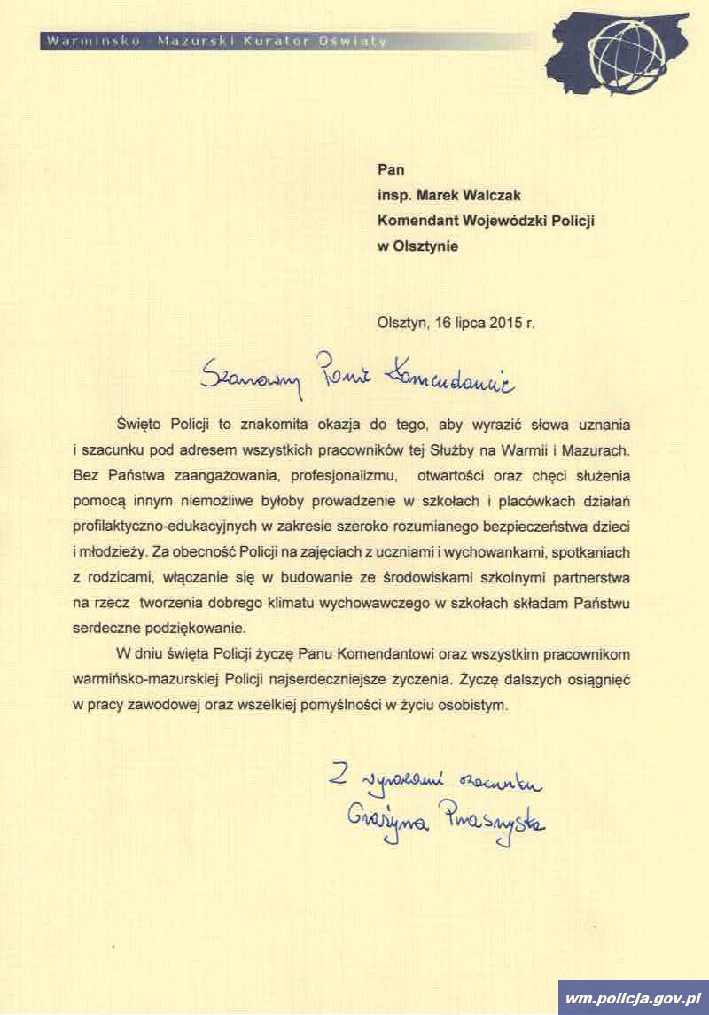 Życzenia od Pani Grażyny Przasnyskiej Warmińsko - Mazurskiego Kuratora Oświaty -