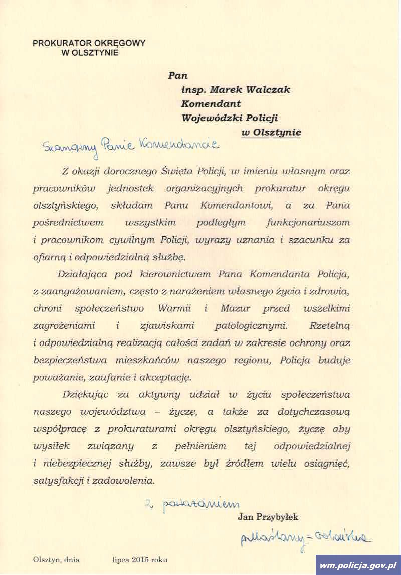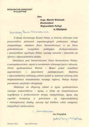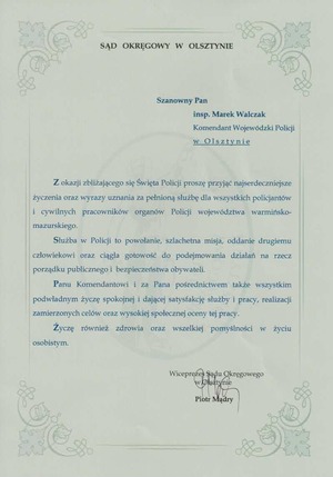 Życzenia od Pana Jana Przybyłka Prokuratora Okręgowego w Olsztynie -