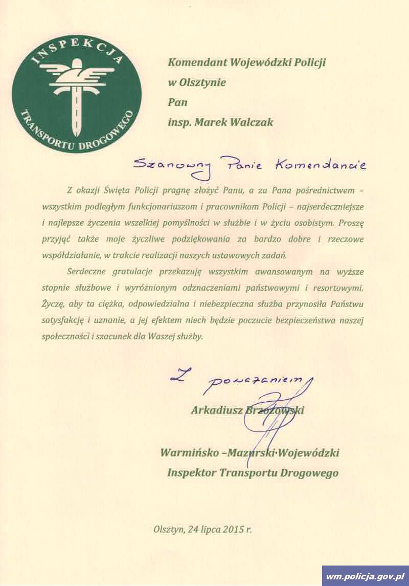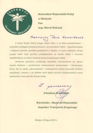 Życzenia od Pana Arkadiusza Brzozowskiego Warmińsko - Mazurskiego Wojewódzkiego Inspektora Transportu Drogowego -