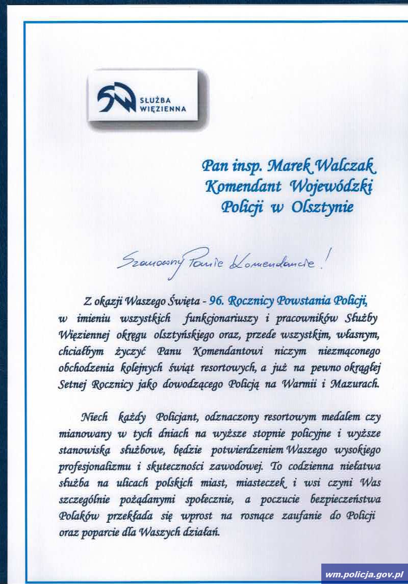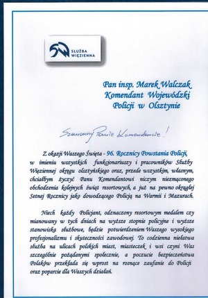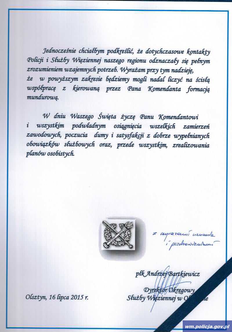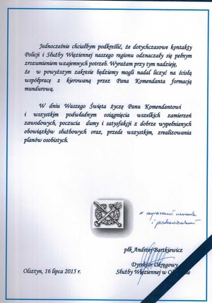 Życzenia od płk Andrzeja Bartkiewicza Dyrektora Okręgowego Służby Więziennej w Olsztynie -