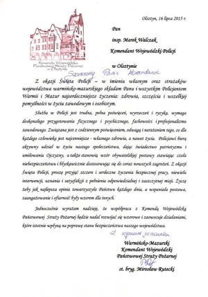 Życzenia od Pana Jarosława Lipińskiego Komendanta Straży Miejskiej w Olsztynie -