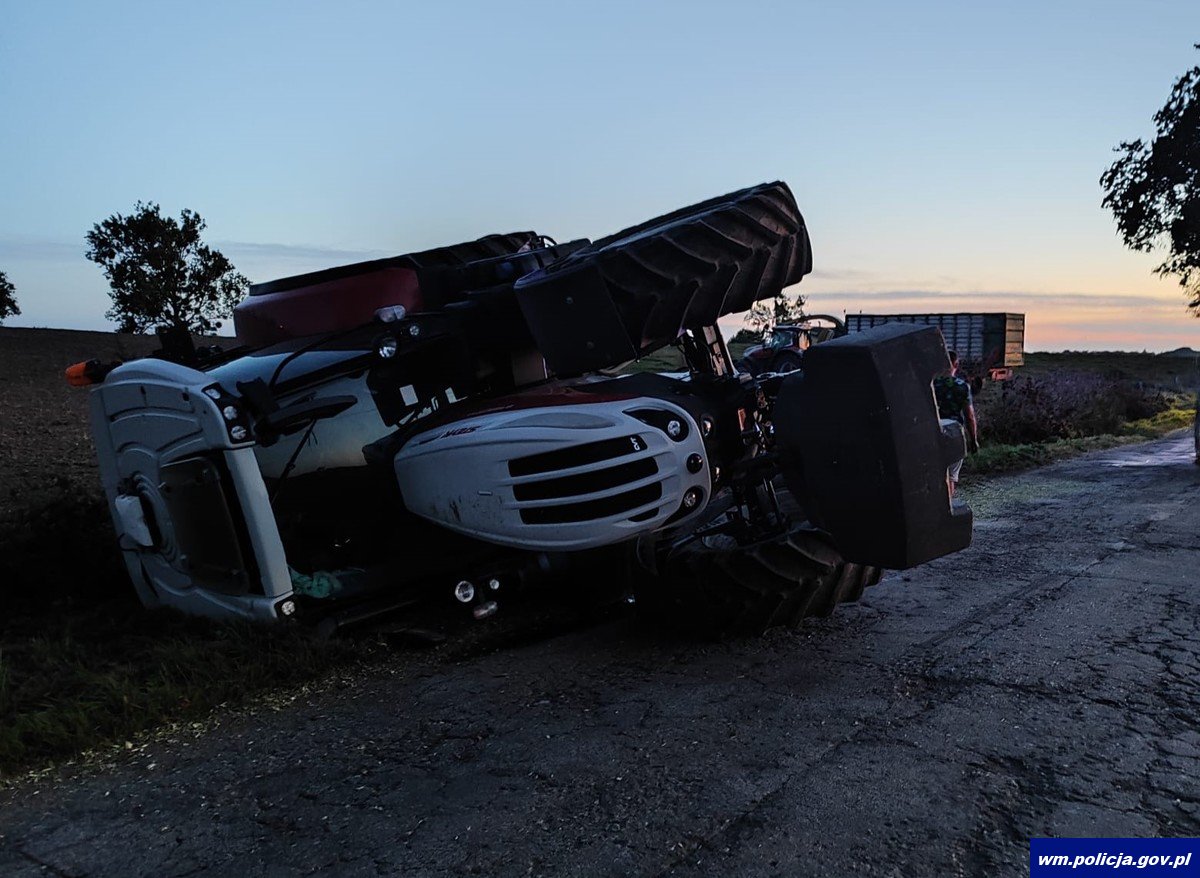 W niedzielę (01.09.2024 r.) policjanci otrzymali zgłoszenie o kolizji ciągnika rolniczego, który przewrócił się na bok. Pracujący na miejscu zdarzenia policjanci ustalili, że kierujący ciągnikiem rolniczym z przyczepą, 21-latek nie dostosował prędkości do warunków drogowych, co spowodowało podbicie przyczepy na wybojach. W rezultacie ciągnik rolniczy przewrócił się na bok, a przyczepa się odczepiła. Kierujący nie odniósł żadnych obrażeń. Policjanci potwierdzili, że posiadał on uprawnienia do kierowania ciągnikiem oraz był trzeźwy. Policjanci zastosowali wobec 21-latka pouczenie, mężczyzna zabezpieczył pojazd we własnym zakresie.