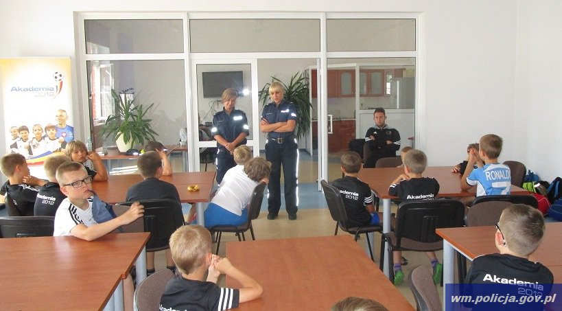 Policjantki z gołdapskiej komendy odwiedziły dzieci, które uczestniczą w sportowym obozie piłkarskim „Akademia 2102”- akcji organizowanej przez suwalskie stowarzyszenie na rzecz promocji sportu. Podczas spotkania z najmłodszymi funkcjonariuszki opowiadały o bezpiecznych formach wypoczynku. Wszystkie dzieci otrzymały odblaskowe gadżety zakupione w ramach III edycji projektu „On, ty i ja na tej samej drodze”.