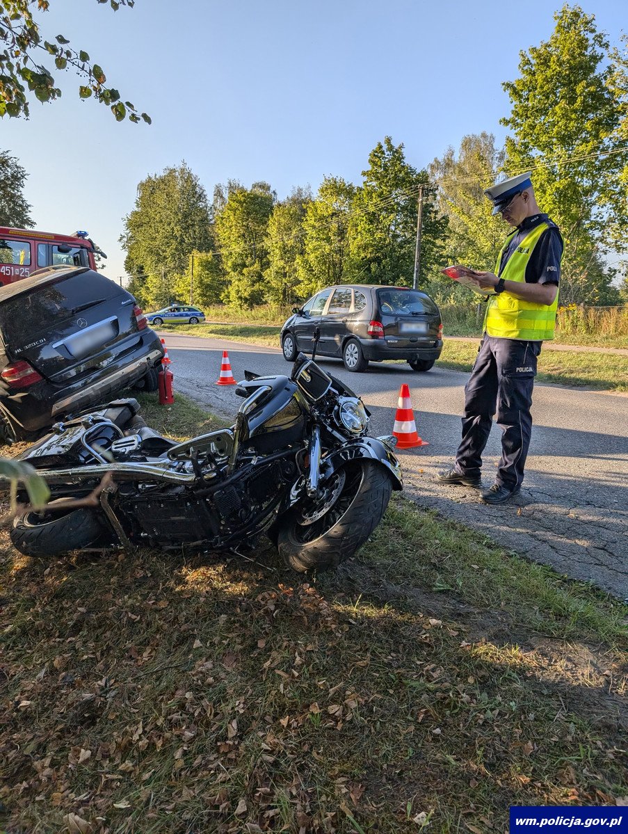W sobotę (21.09.2024 r.) kilkanaście minut przed godz. 15:00 doszło do zdarzenia drogowego w Botkunach na drodze wojewódzkiej nr 651. Policjanci pracujący na miejscu wypadku wstępnie ustalili, że kierujący osobowym mercedesem z nieustalonych dotychczas przyczyn zjechał na lewy pas ruchu i uderzył w unieruchomiony motocykl, na którym siedział 56-letni mężczyzna. Sprawca wypadku oddalił się z miejsca zdarzenia. Motocyklista został przetransportowany do szpitala śmigłowcem Lotniczego Pogotowia Ratunkowego. Śledczy wraz z technikiem kryminalistyki przeprowadzili oględziny miejsca zdarzenia i zabezpieczyli ślady. Policjanci wyjaśniają szczegółowe przyczyny i okoliczności tego zdarzenia.