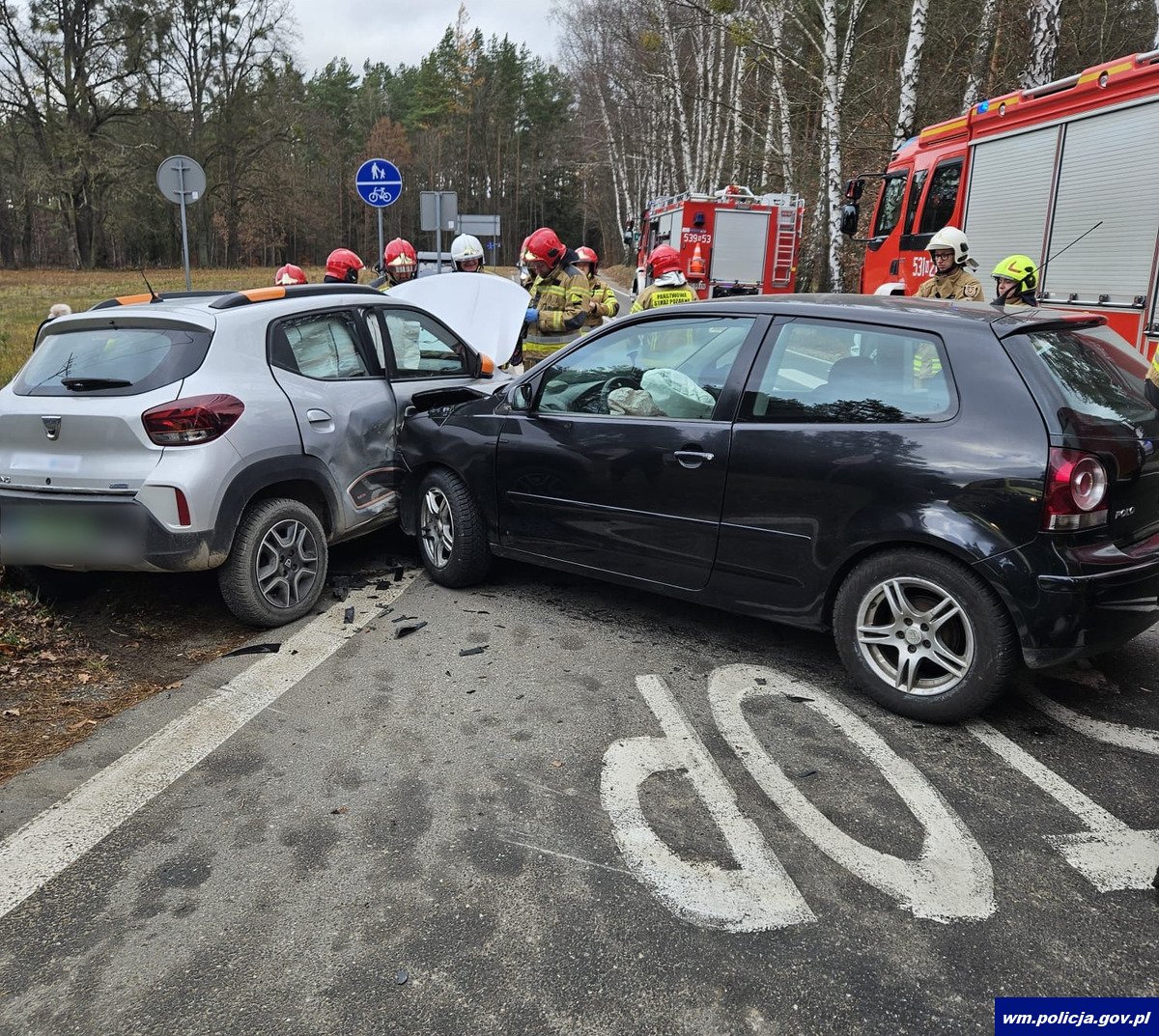 Tego samego dnia kilka minut przed godz. 12:00 oficer dyżurny gołdapskiej jednostki został poinformowany o tym, że na drodze gruntowej w Bludziach Małych (gm. Dubeninki) doszło do zdarzenia drogowego, w którym uczestniczyły dwa pojazdy osobowe. Policjanci pracujący na miejscu wstępnie ustalili, że na łuku drogi doszło do czołowego zderzenia się pojazdów, w których podróżowały łącznie cztery osoby. Osobową hondą podróżował 48-letni mężczyzna wraz z 27-letnim pasażerem, natomiast skodą poruszał się 52-letni mężczyzna wraz z 48-letnią kobietą. Kierujący byli trzeźwi.