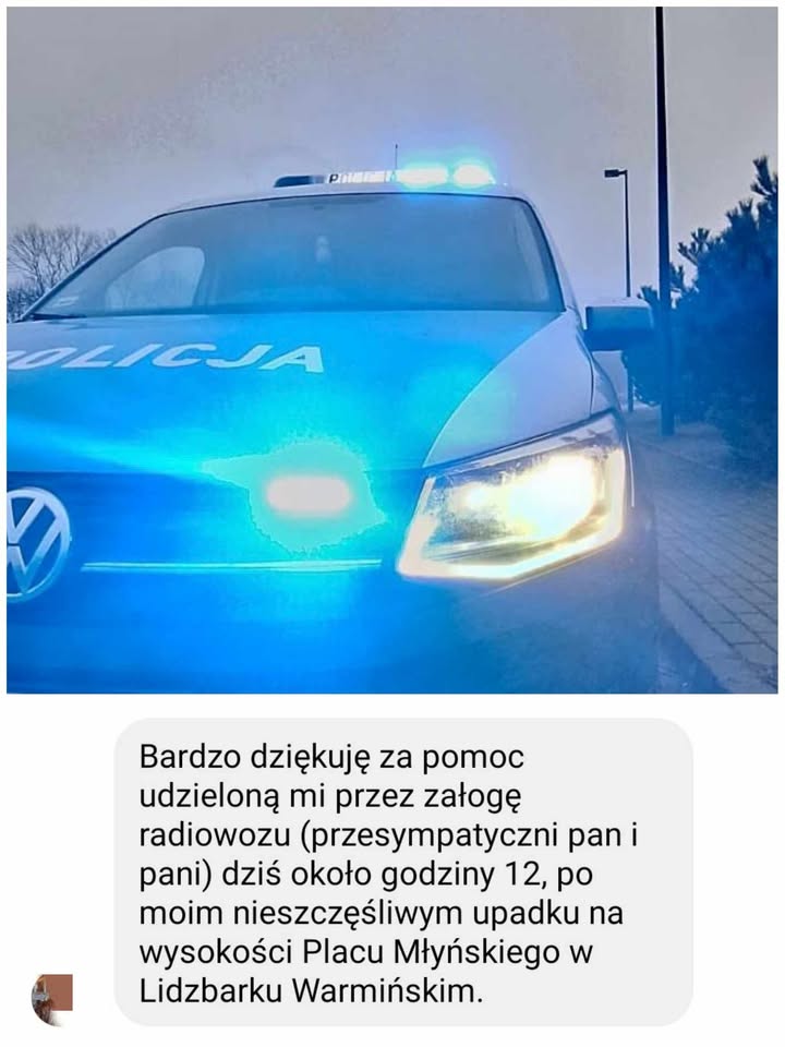 Po wstępnym rozpoznaniu, okazało się, że kobieta potknęła się o wystającą płytkę chodnikową, co doprowadziło do jej upadku i obrażeń. Policjanci niezwłocznie wezwali karetkę pogotowia oraz udzielili kobiecie niezbędnej pomocy. W celu zapewnienia jej bezpieczeństwa, mundurowi zaprowadzili do radiowozu, gdzie mogła poczuć się bezpiecznie, aż do momentu przybycia ratownikó, udzielając jej w tym czasie wsparcia psychicznego. Ostatecznie poszkodowana trafiła pod opiekę załogi karetki pogotowia. Do jednostki Policji w Lidzbarku Warmińskim wpłynęły serdeczne podziękowania za udzieloną jej pomoc.