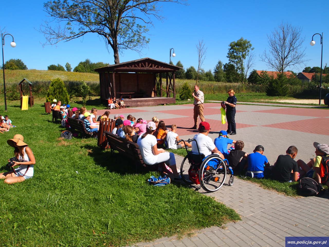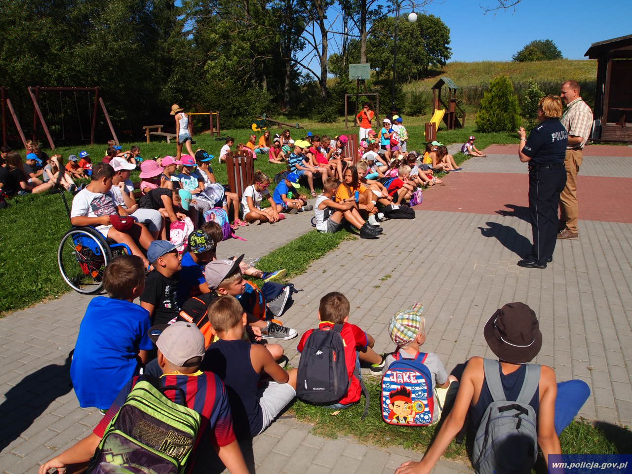 Policjantka wspólnie z pracownikiem WORD przekazała podstawowe zasady bezpieczeństwa w ruchu drogowym. Mówiono o bezpiecznym poruszaniu się po drogach a także obowiązku posiadania elementów odblaskowych. W planie na ten tydzień uczestnicy półkolonii mają również wyjazd do Krynicy Morskiej, gdzie będą korzystały z kąpieliska. Przypomniano w tym celu zasady bezpiecznego zachowania nad wodą, zakazie kąpieli w miejscach niestrzeżonych. Korzystając z tej okazji policjantka apelowała do dzieci o zachowanie bezpieczeństwa podczas trwających prac polowych.