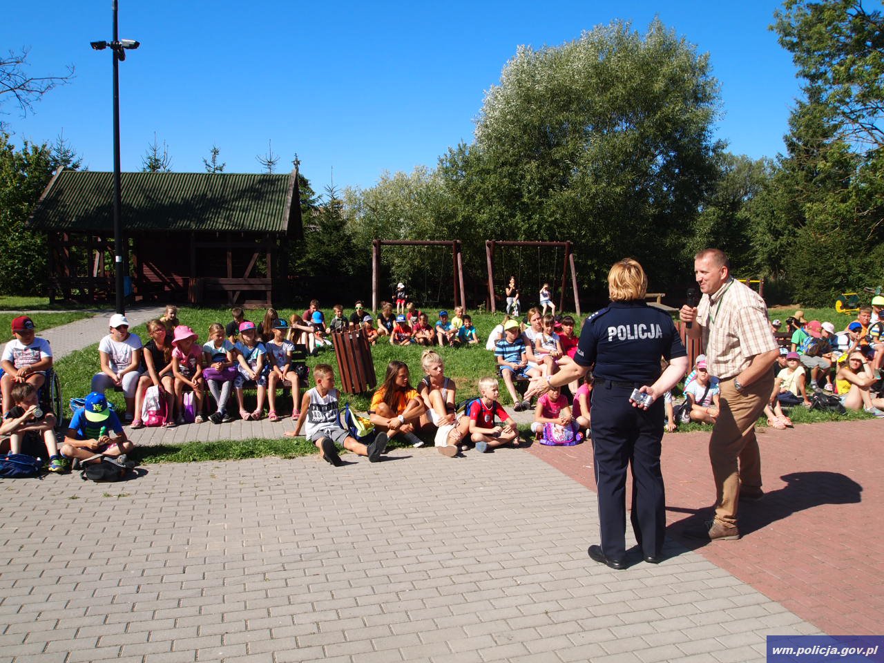 Policjantka z Wydziału Prewencji Kryminalnej i Wykroczeń Komendy Miejskiej Policji w Elblągu wspólnie z pracownikiem Wojewódzkiego Ośrodka Ruchu Drogowego w Elblągu poprowadzili spotkanie z dziećmi wypoczywającymi na półkolonii w Pogrodziu.