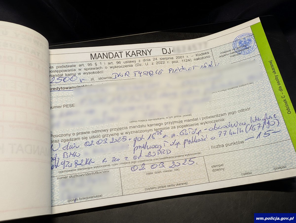 W niedzielę (02.03.2025) policjanci piskiej drogówki zatrzymali do kontroli drogowej pojazd marki Peugeot. Było to na trasie Pisz-Orzysz. Samochodem tym kierował 80-letni mieszkaniec Giżycka. Powodem kontroli było przekroczenie dozwolonej prędkości przez kierującego peugeotem. W rejonie przejścia dla pieszych, poza obszarem zabudowanym, kierowca ten miał na liczniku 123 km/h, gdzie obowiązywało ograniczenie do 50 km/h. Za popełnione wykroczenie kierowca ten ukarany został mandatem w wysokości 2500 zł i 15 punktami karnymi.