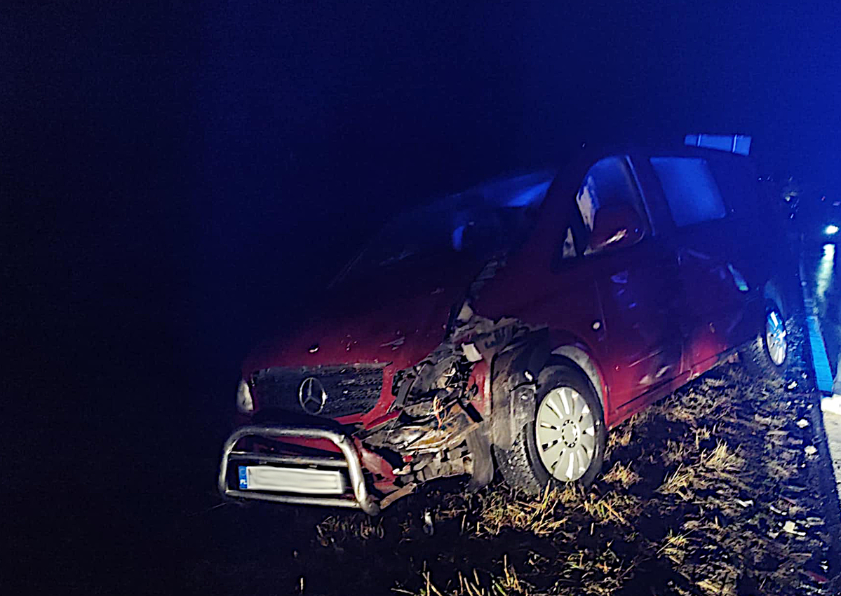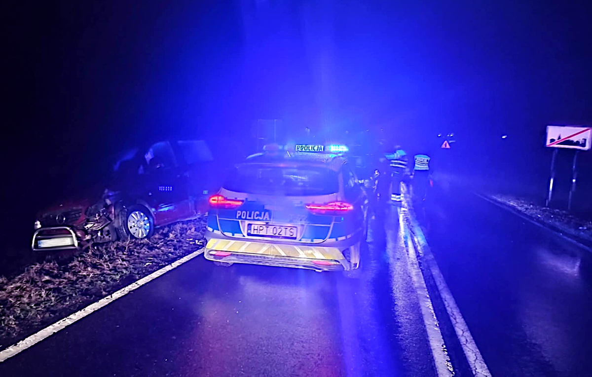 Tymczasem kilka minut przed godziną 16:00, 54-latka kierująca kią nie dostosowała prędkości do warunków atmosferycznych, po czym na łuku drogi straciła panowanie nad pojazdem, zjechała na przeciwległy pas ruchu i uderzyła w bmw, a następnie mercedesa. Kobieta z obrażeniami ciała została przetransportowana do szpitala.