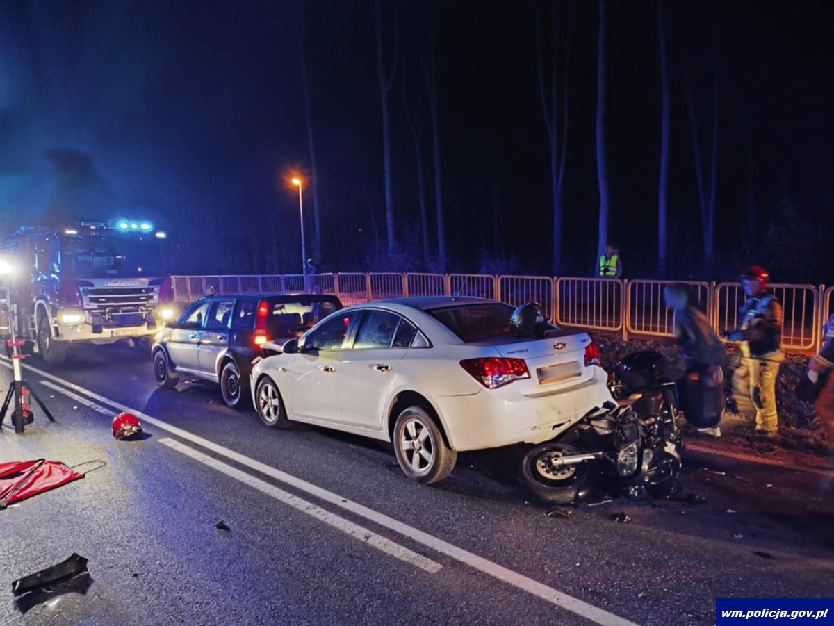 Tymczasem o godzinie 18:00 na trasie Iława-Lubawa doszło do potrącenia 38-latka, który wtargnął na jezdnię poza obszarem zabudowanym, bez elementów odblaskowych. Mężczyzna został potrącony przez kierującego hondą, w którą następnie uderzyła kierująca chevroletem, a na chevroleta najechał motocyklista. 38-letni pieszy został przetransportowany helikopterem Lotniczego Pogotowia Ratunkowego do szpitala.