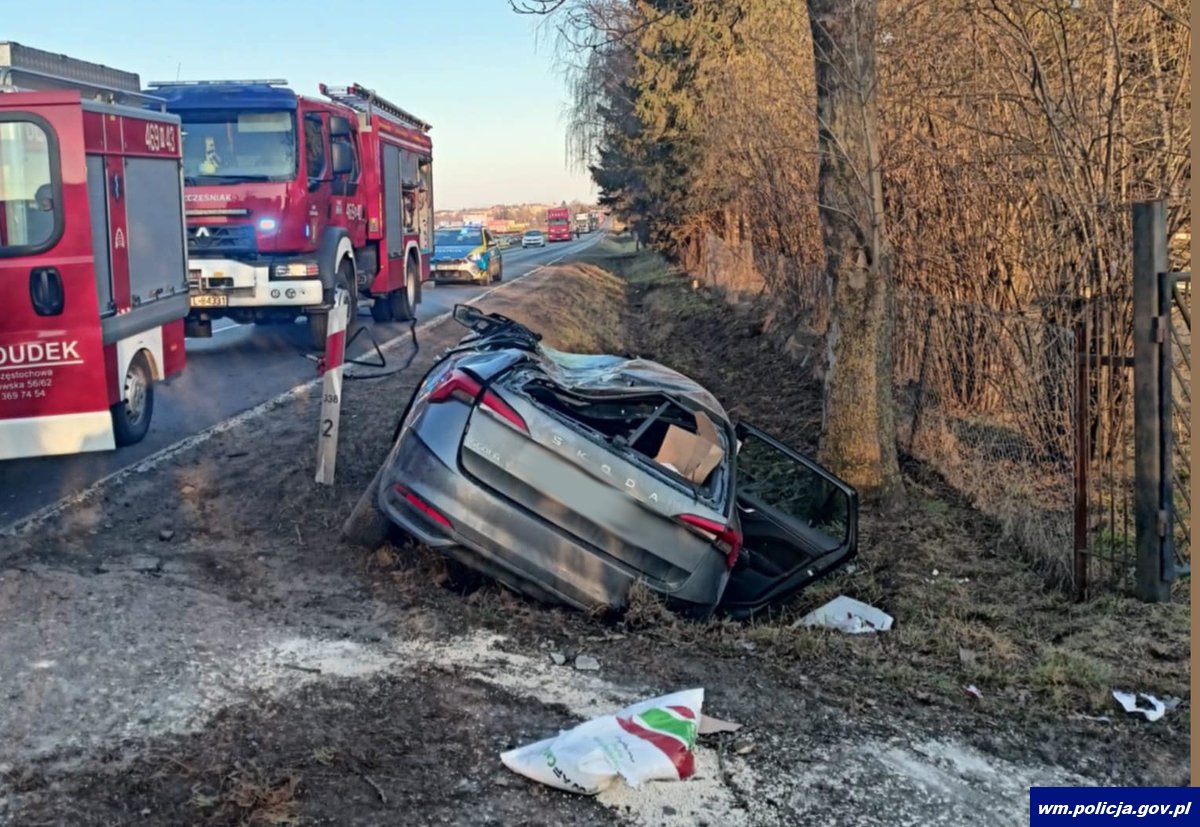 Natomiast po godzinie 15:00, 23-latek kierujący bmw na prostym odcinku drogi nie upewnił się co do możliwości wykonania manewru wyprzedzania i podejmując ten manewr, doprowadził do zderzenia bocznego ze skodą, który był w trakcie wyprzedzania bmw. W wyniku zderzenia pojazdy zjechały na lewe pobocze. Następnie kierujący skodą uderzył w przydrożne drzewo. Kierujący skodą, jak i jej 3-letni pasażer zostali przetransportowani do szpitala.