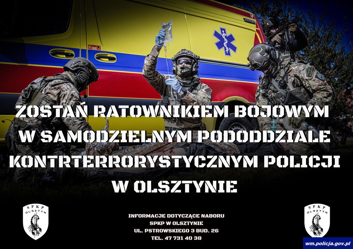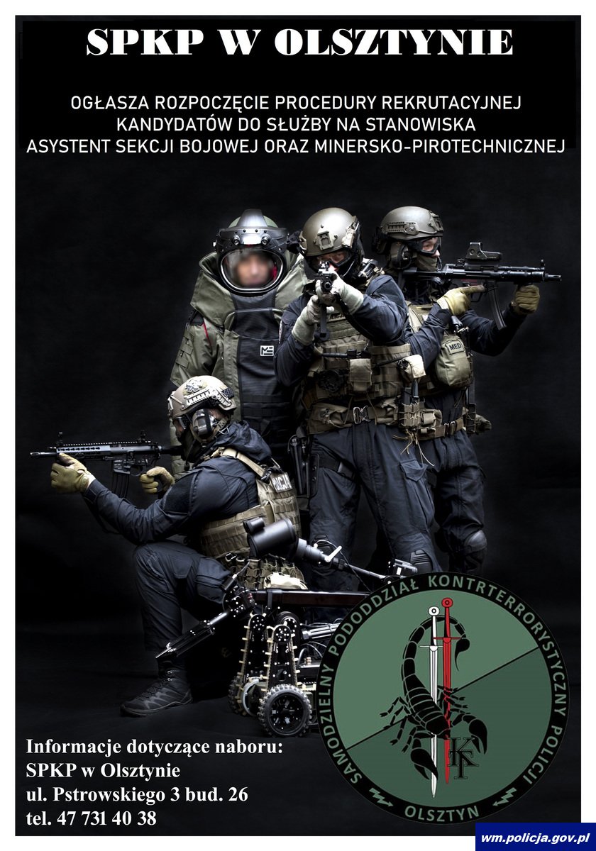 Trwa postępowanie kwalifikacyjne dla kandydatów do służby w Samodzielnym Pododdziale Kontrterrorystycznym Policji w Olsztynie na stanowiska w Sekcji Bojowej i Sekcji Minersko-Pirotechnicznej. Ponadprzeciętna sprawność fizyczna, bardzo dobry stan zdrowia, wysoka odporność na sytuacje stresowe, umiejętność pracy w zespole i szybkiej adaptacji do nagłych zmian - to cechy, które musi posiadać każdy policyjny kontrterrorysta. Nie każdy się do tego nadaje, ale każdy kto czuje się na siłach, może spróbować dołączyć do SPKP w Olsztynie.
