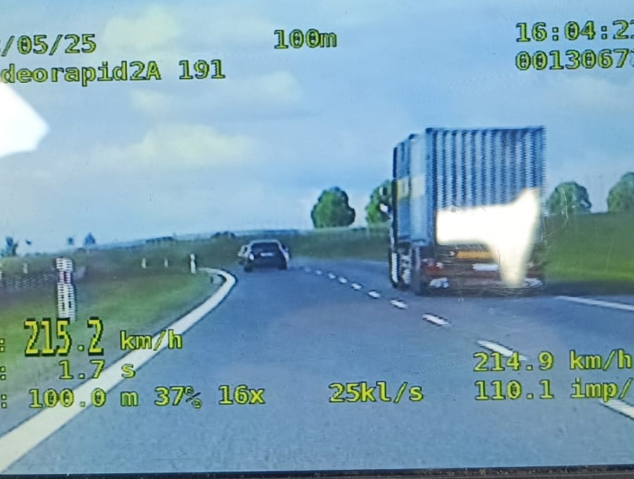 Tego samego dnia (18.05.2025 r.) około godz. 16:00 policjanci nidzickiej drogówki podczas pełnienia służby na drodze ekspresowej S7 na wysokości miejscowości Rączki zauważyli kierującego samochodem osobowym marki Volvo, który przemieszczał się z dużą prędkością. Miernik wskazał, że na ograniczeniu prędkości do 120 km/h kierujący jechał z prędkością 215 km/h. Przekroczenie dozwolonej prędkości jazdy o 95 km/h zakończyło się dla 52-letniego mieszkańca Gdańska, mandatem w kwocie 2500 zł i 15 punktami karnymi.