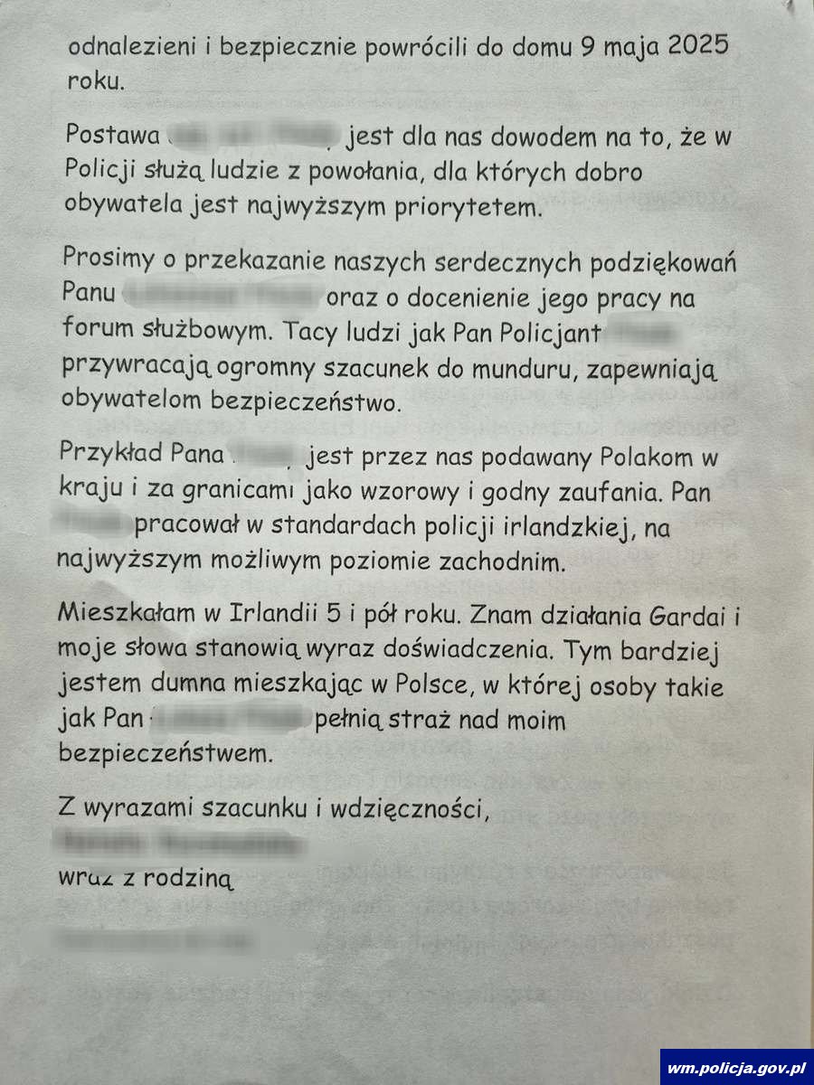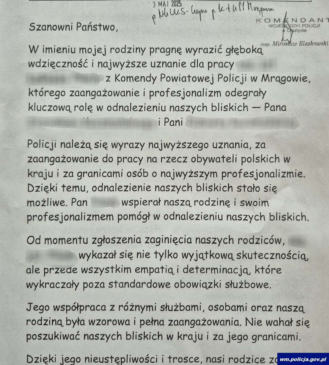 Na ręce Komendanta Wojewódzkiego Policji w Olsztynie, insp. Mirosława Elszkowskiego, wpłynął wyjątkowy list z podziękowaniami dla funkcjonariusza Komendy Powiatowej Policji w Mrągowie. Autorem listu jest rodzina zaginionego małżeństwa, która z głęboką wdzięcznością wyraziła uznanie dla zaangażowania, profesjonalizmu i empatii, jakie wykazał mrągowski policjant podczas prowadzonych poszukiwań.