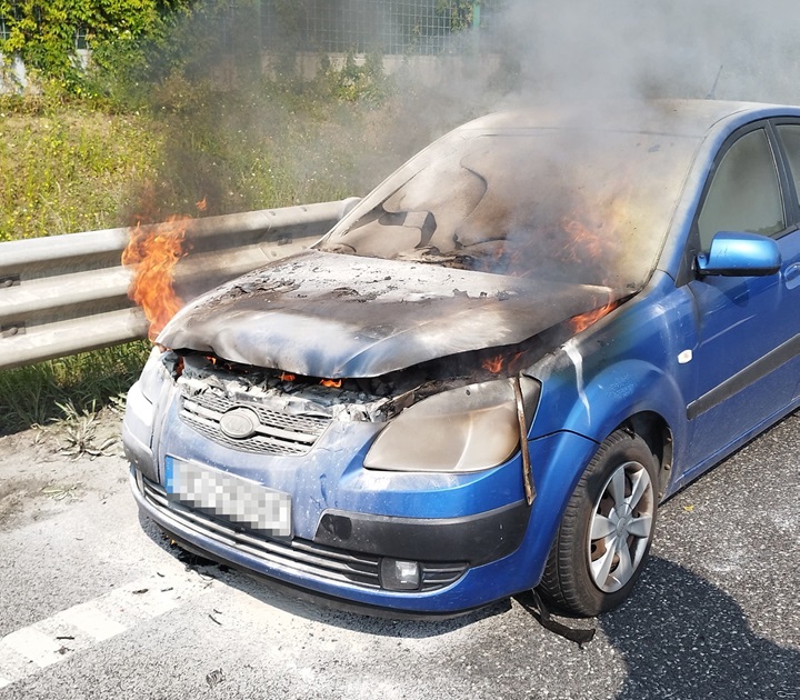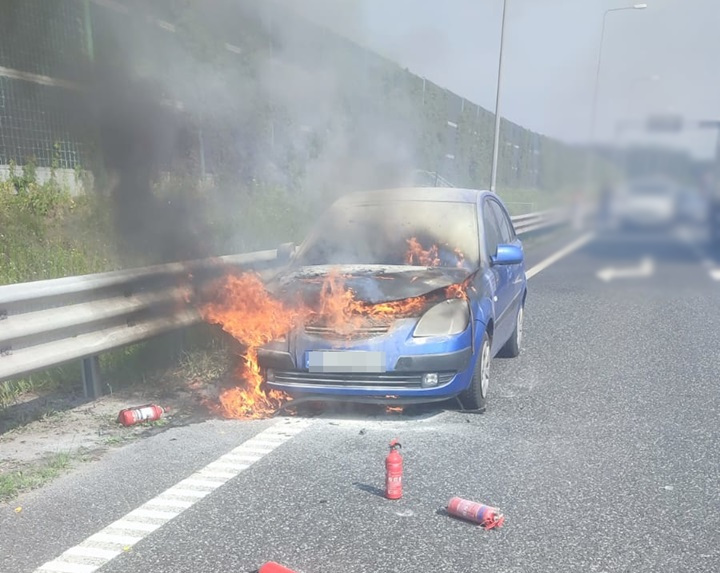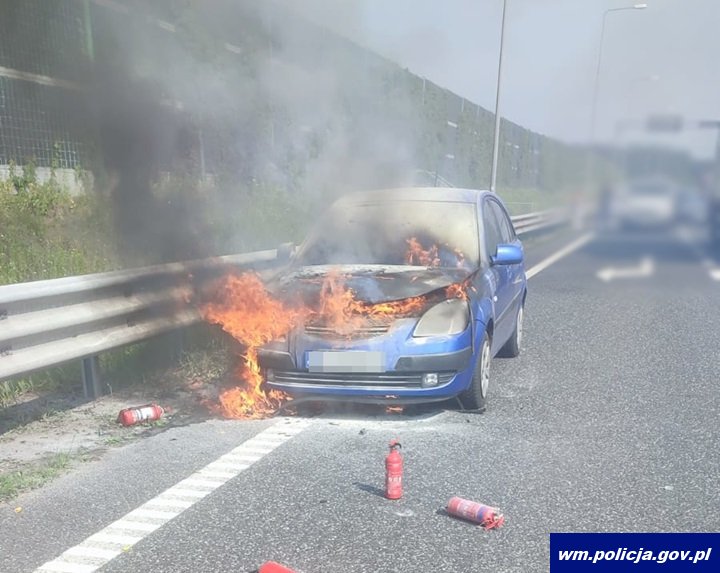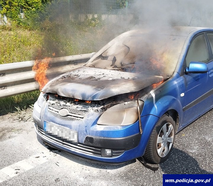 Zdarzenie miało miejsce we wtorek (10.06.2025 r.) rano. Policjanci st. post. Jakub Roch i st. sierż. Adam Osowski z Komisariatu Policji w Lidzbarku poruszając się radiowozem oznakowanym w drodze do Olsztyna w pewnym momencie zauważyli na trasie S 7 pojazd marki Kia, spod komory którego wydobywał się dym. Bez chwili zawahania policjanci zatrzymali się i natychmiast przystąpili do akcji ratunkowej. Zabezpieczyli miejsce zdarzenia i przystąpili do gaszenia auta gaśnicą samochodową. Na miejscu znajdowali się podróżujący autem 56-latek i 53-latka z Olsztyna. Oboje opuścili pojazd, nie doznając żadnych obrażeń. Po kilku minutach na miejsce zdarzenia dotarły zastępy straży pożarnej z pobliskich miejscowości oraz patrol Policji z Olsztynka, które przejęły akcję dogaszania auta.