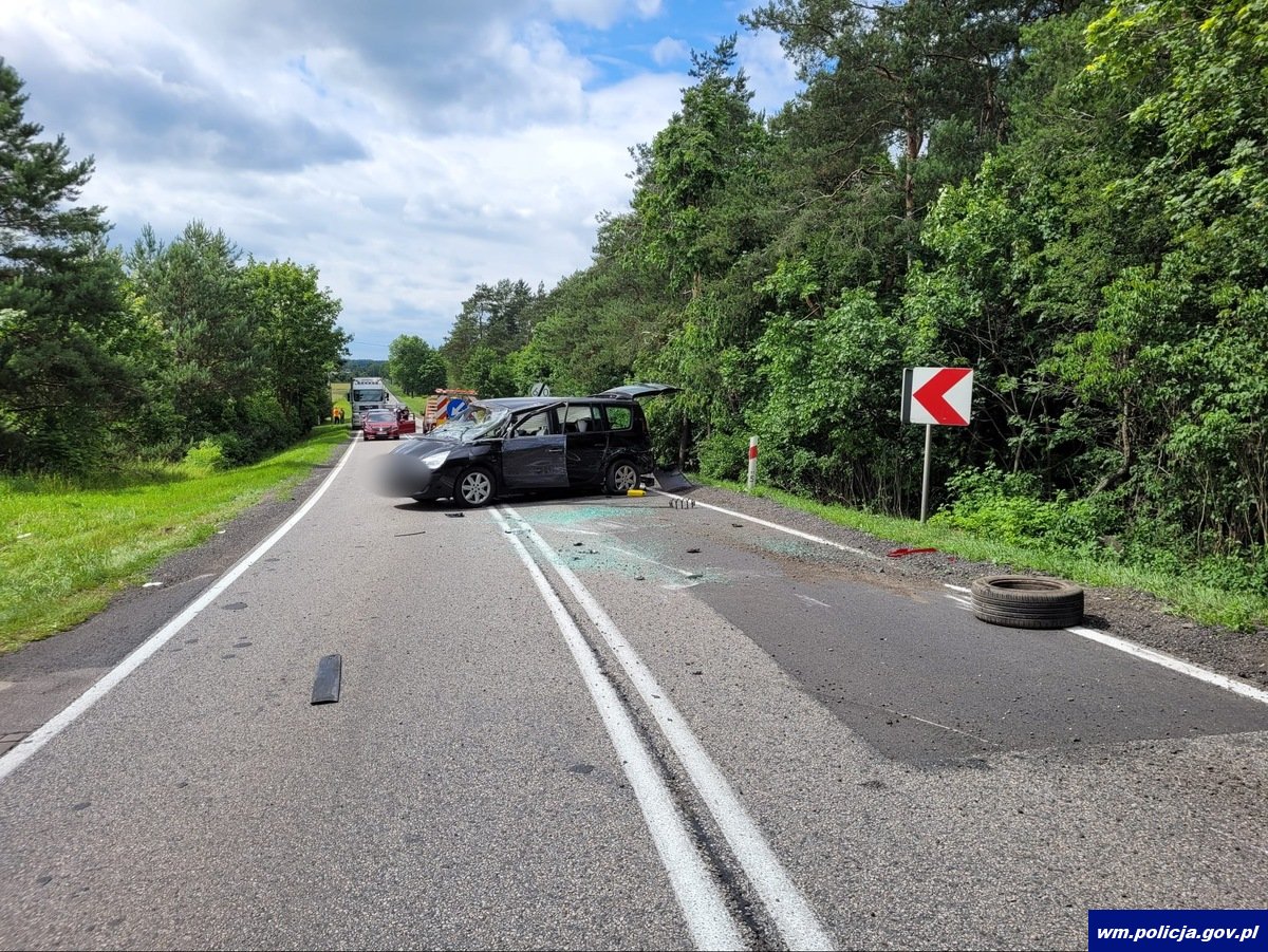 Również w sobotę po godzinie 14:00 oficer dyżurny ostródzkiej jednostki policji otrzymał zgłoszenie o zdarzeniu drogowym, do którego doszło na odcinku drogi Wirwajdy-Samborowo w gminie Ostróda. Jak ustalili policjanci będący na miejscu zdarzenia, 78-letni kierujący toyotą z uwagi na złe samopoczucie, zjechał na przeciwległy pas ruchu, gdzie uderzył w jadący z naprzeciwka pojazd marki Renault, który po zderzeniu wywrócił się. W wyniku zdarzenia pasażerowie pojazdu marki Renault, 38-letnia kobieta oraz dwoje dzieci w wieku 6 i 8 lat zostali przetransportowani do szpitala celem diagnostyki. Droga na czas wykonywanych czynności przez służby była zablokowana w obu kierunkach, a policjanci kierowali na objazdy.